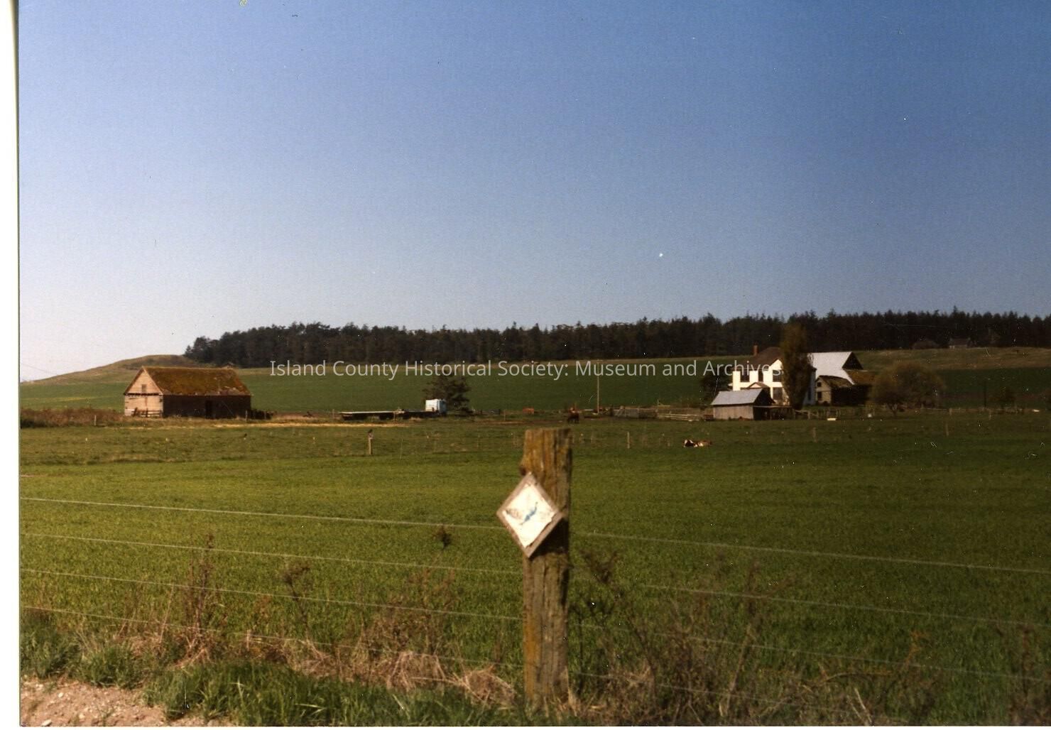Photo of Smith Farm. Shows barn and home. Fence post with Ebey's bluff in the background. Shows fence row with a post and a triangular sign. Unable to decipher the triangle sign.