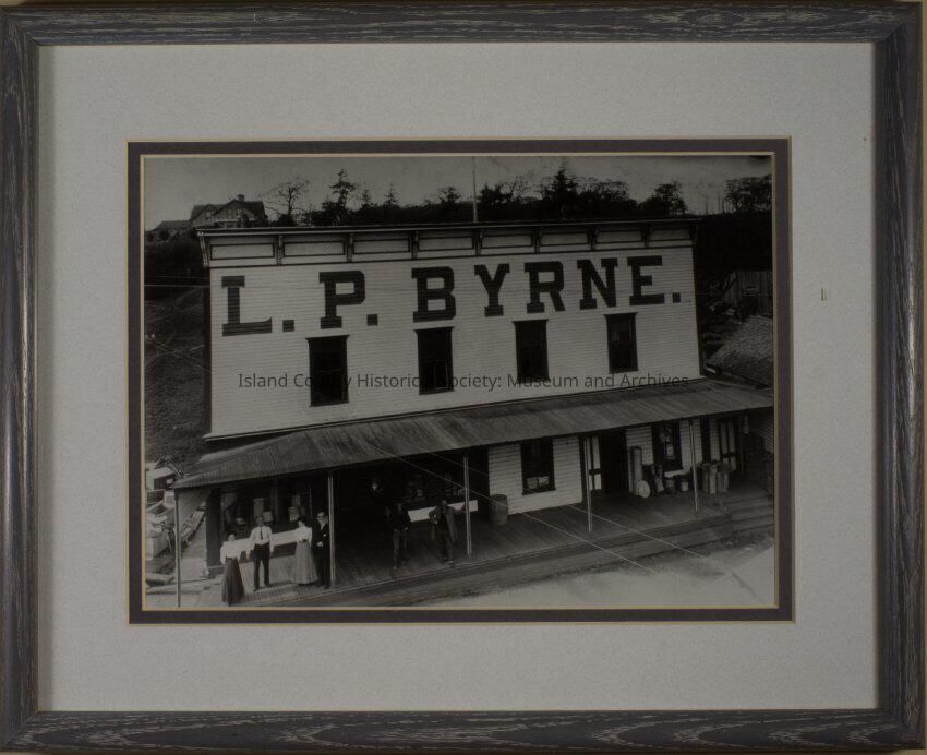 Black and white photo in gray frame. Framed picture of L.P. Byrne Mercantile store with the home in the background. Oak Harbor, WA. Men and women standing on the porch.