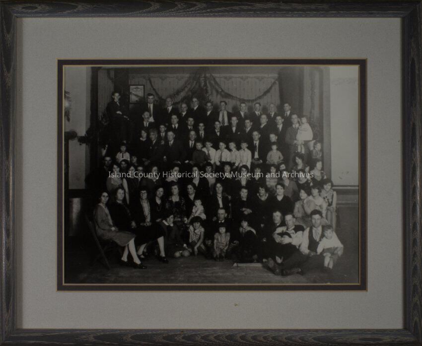Black and white photo in gray frame of large group of people, adults and children, taken interior of a building. Some are on the floor, others in chairs, others on risers and/or a stage. Garlands are looped at the back.Made/Created
