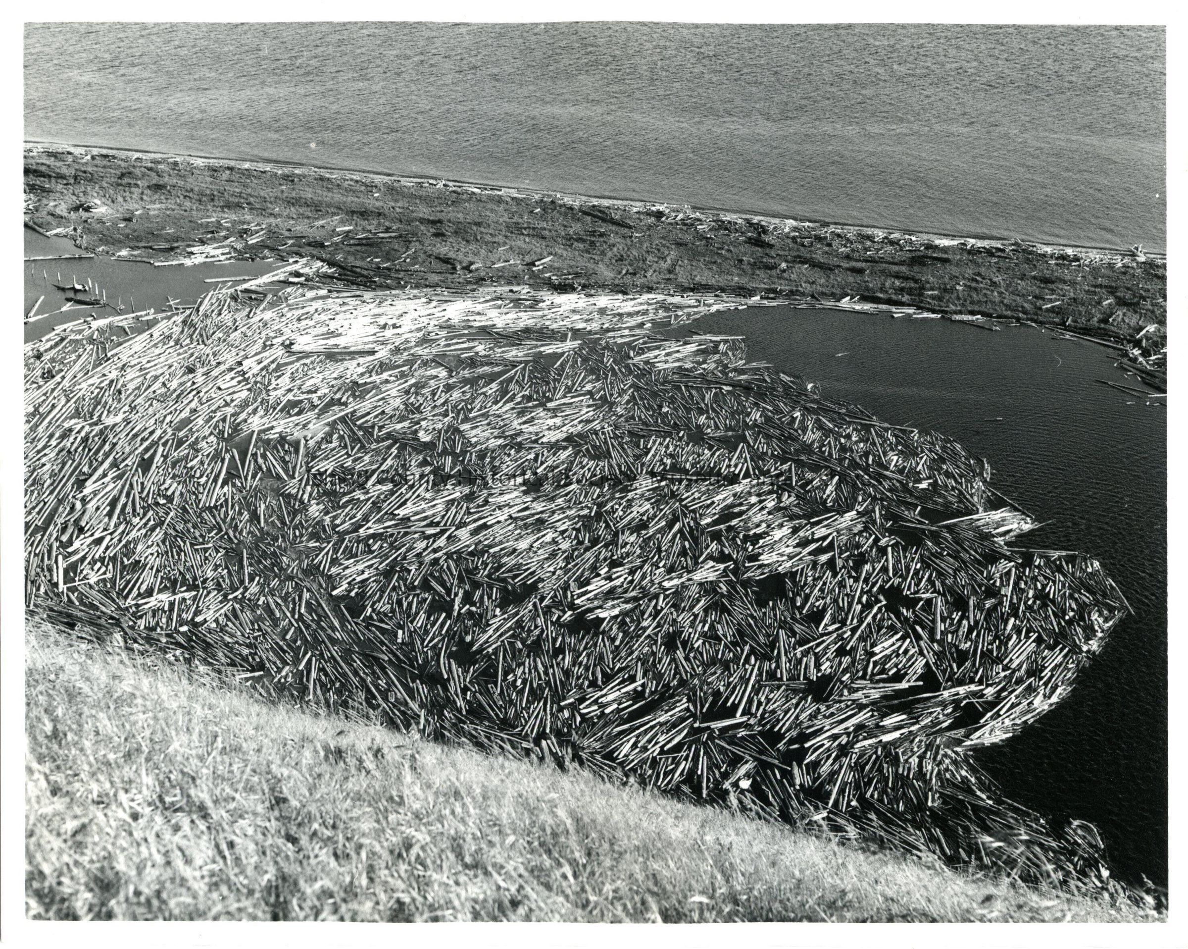 Black and white photo of Perego's lake with wood debris washed in. Photo states Perego's Lake from the bluff 1971.