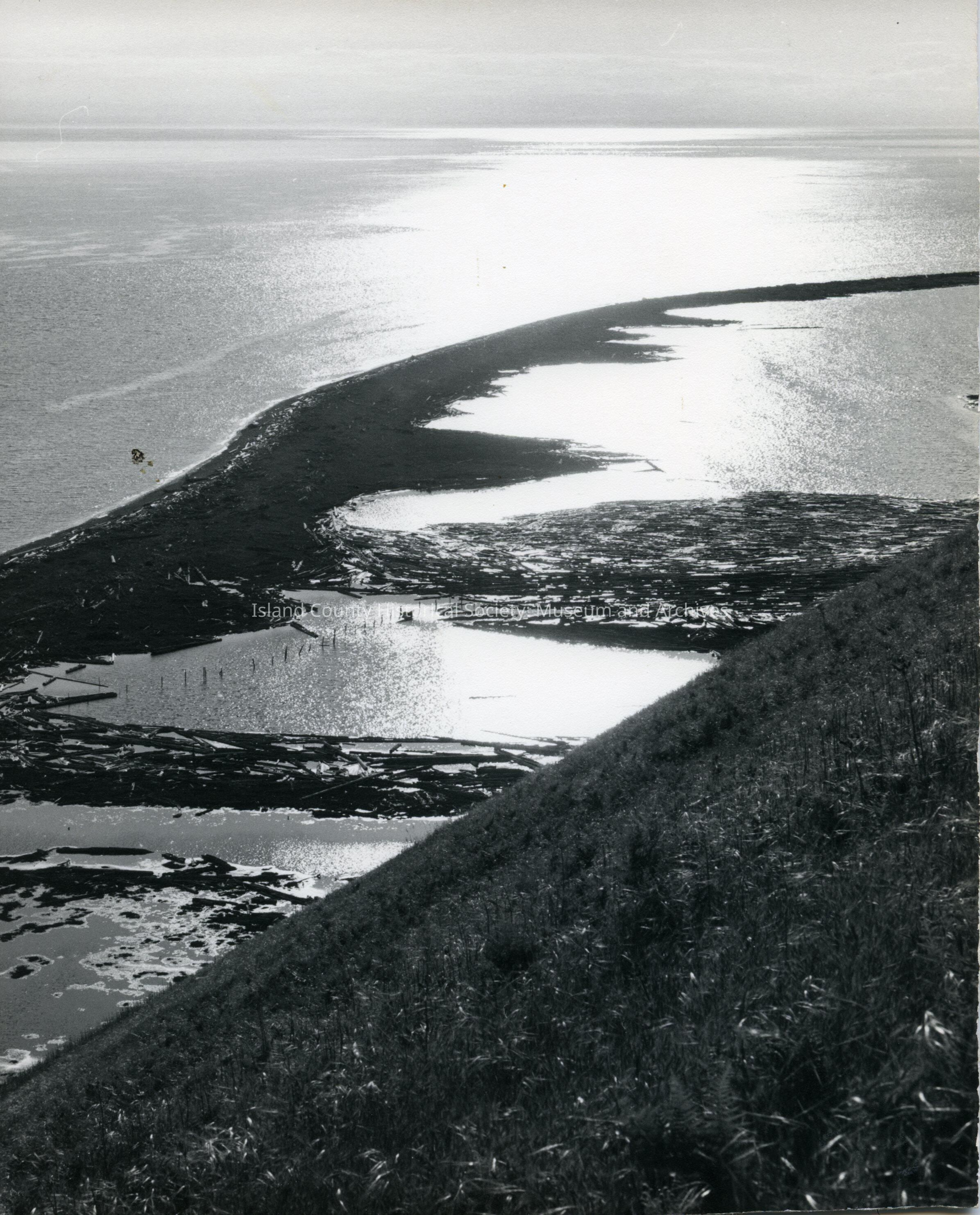 Photo description on the back states: Site #8 Perego's bluff, lake, and point. George W.S.H. Perego, a veteran of the Seminole, Mexican and Cival Wars homesteaded here in 1876. He was a recluse and lived with his three dogs on the spit in a shanty until his death in 1900. He was wild-looking and covered with vermin. He so captured the curiosity of the staid farmers on the prairie that even after seventy years and with no official designation, this is known as Perego's bluff. The action of the waters of Admiralty Inlet and the Strait of Juan de Fuca meeting at this point form the spit.