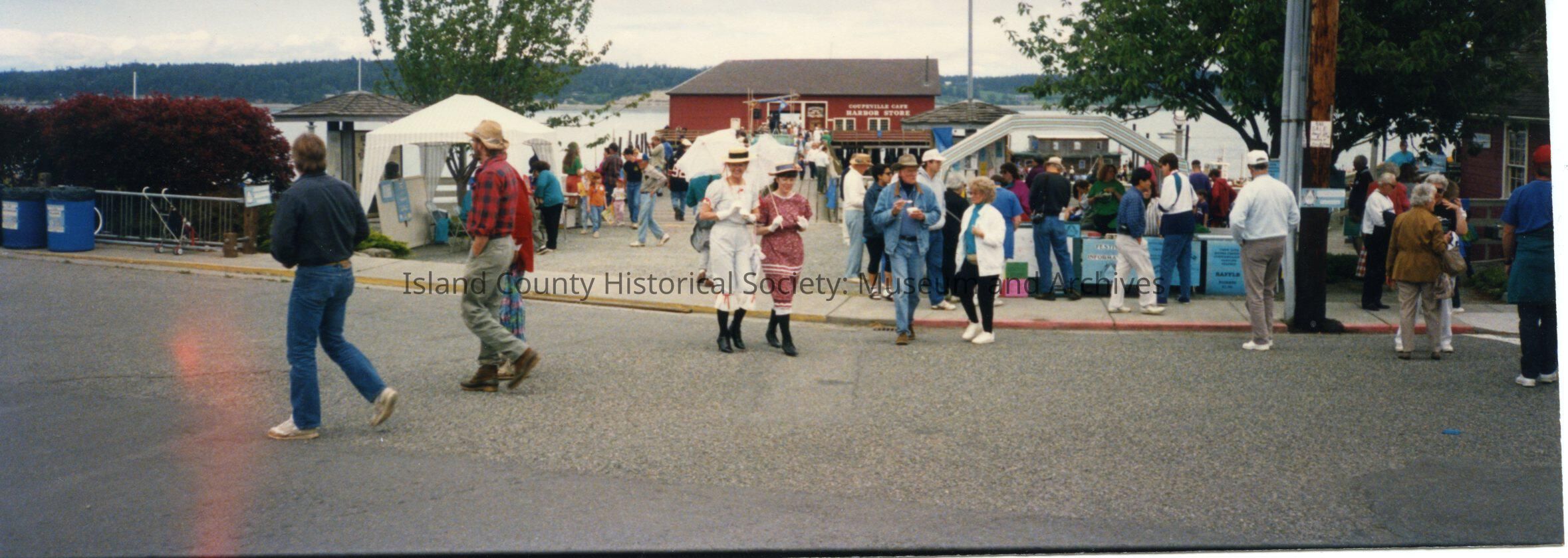 Panorama color photo of the Coupeville Water Festival, 2002. People in front of Coupeville Wharf at the corner of Alexander Street and Front Street. Vendor tents.