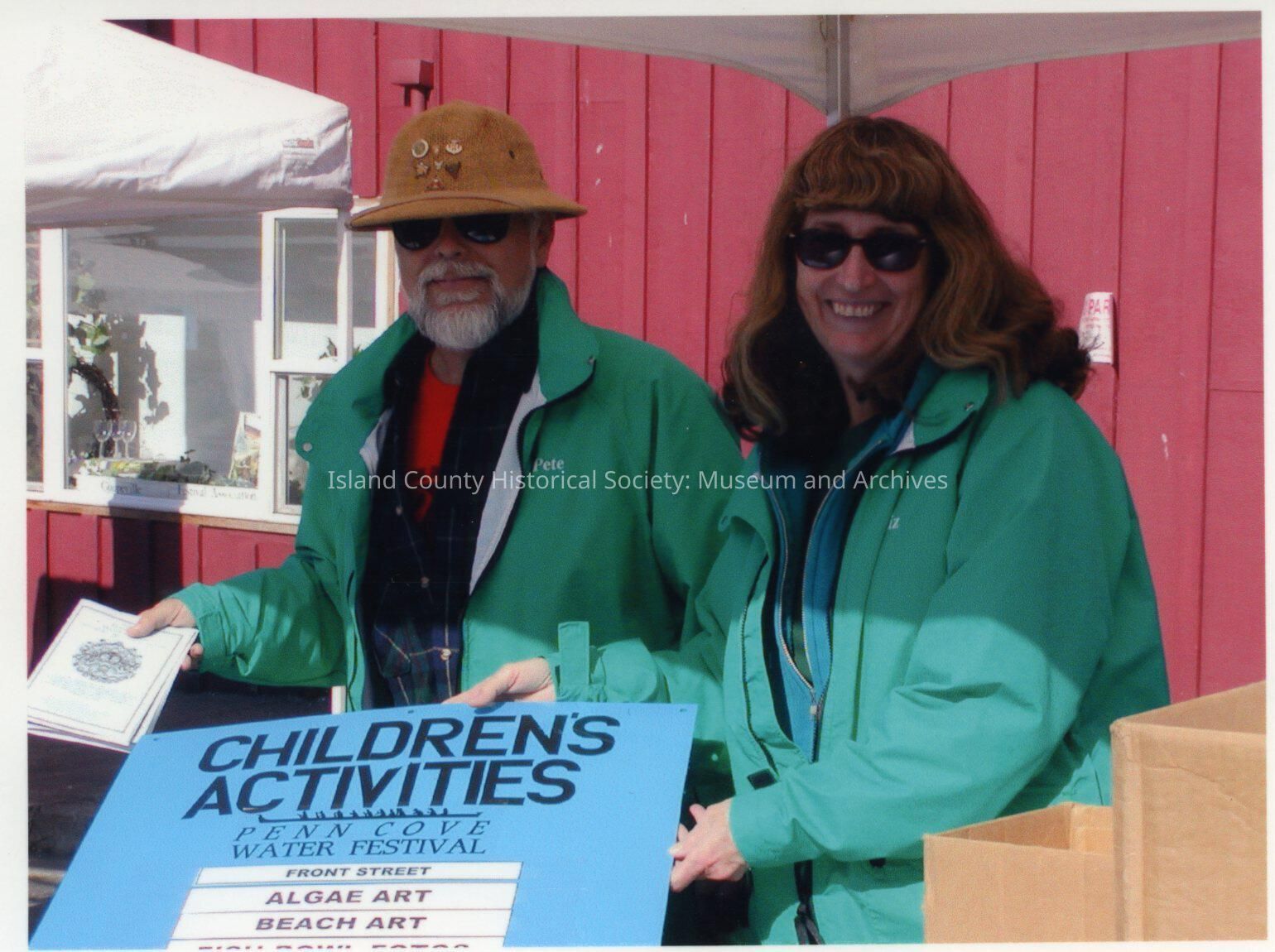 Coupeville Water Festival, 2002. A man and woman, in green windbreaker jackets hold a sign of Children's Activities. He is wearing a brown hat with pins on the front. They are standing beside the Honey Bear on Alexander Street.Collection