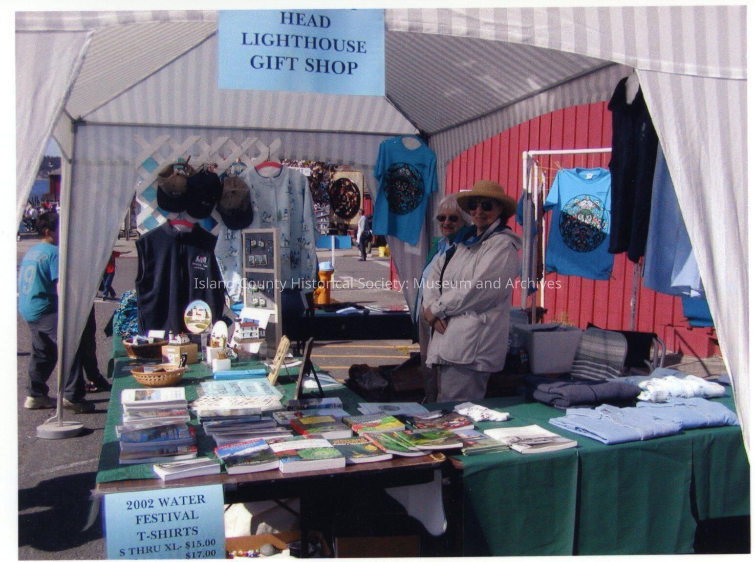 Coupeville Water Festival, 2002. Two women running a vending table with a marquee for the Admiralty Head Lighthouse gift shop. The tables have items (books, toys, clothing) relating to the lighthouse as well as the festival canoe races. They are on Alexander Street beside the Honey Bear shop.Collection