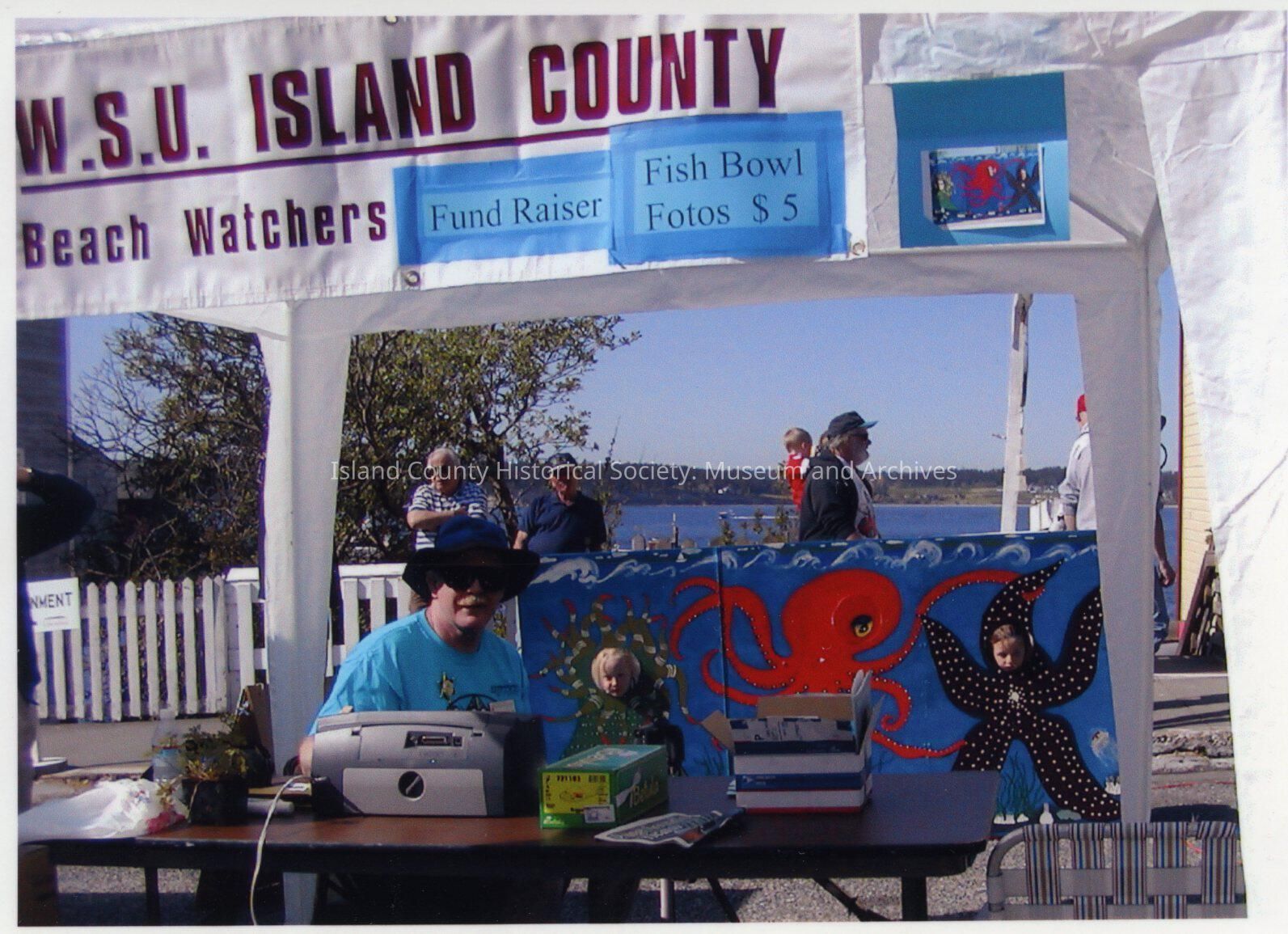 Coupeville Water Festival, 2002. Man wearing a hat sitting at a vending table on Front Street in front the white picket fence. Two children are poking their heads through the board with an octopus, seastar and anenome. A man is walking behind them with a toddler in a carrier on his back. Two other men are looking at the camera.Collection