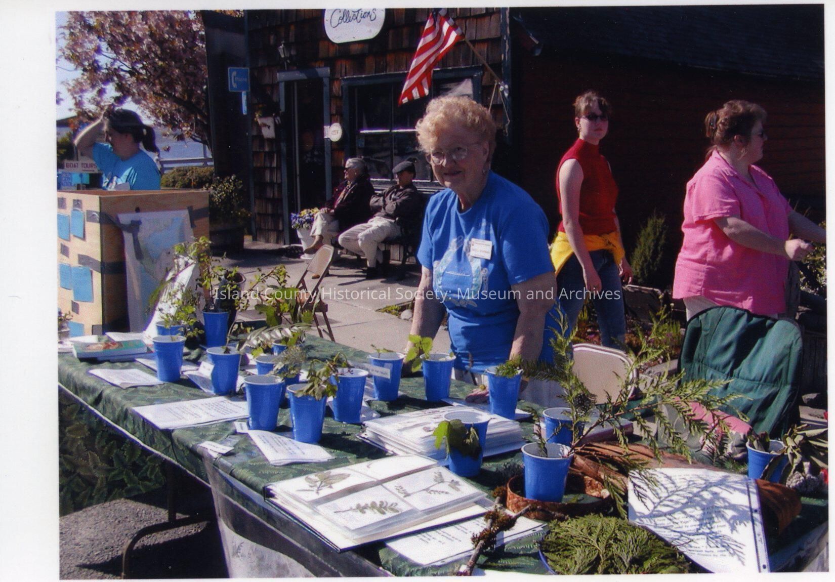 Coupeville Water Festival, 2002. Two women at vending tables on Front Street in front of Collections shop (at one time the meat market). One is selling artwork. The one in the center of the photo is selling plants in blue plastic cups. She has books and papers explaining the plants.Collection