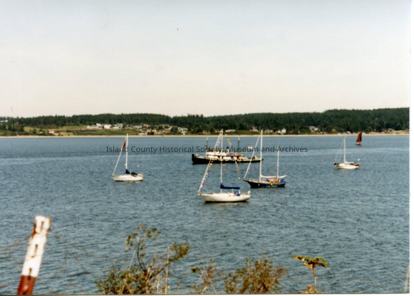 Coupeville Water Festival, 1993. Five sail boats sailing or at anchor in the Cove. A large motor boat/tug boat is also present.