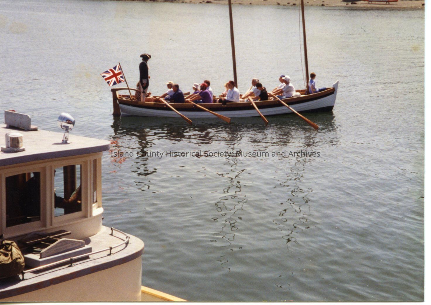 Coupeville Water Festival, 1993. One of the 8-person row/sail boats is in the water off the wharf. A man in Colonial uniform is standing in the stern holding the tiller. Behind him is the Union Jack/British flag. In the lower left is the cabin of a motor boat.Collection