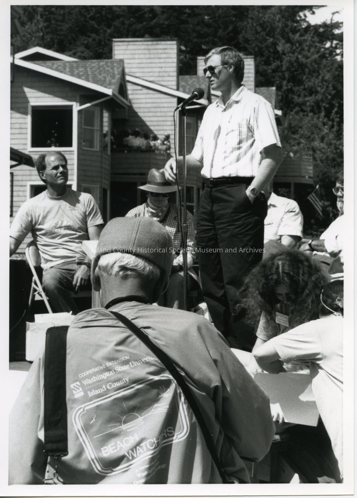 Coupeville Water Festival, 1992. Black and white photo. A group of men are sitting, one is standing, on a raised platform. The podium is near the wharf and museum.Collection