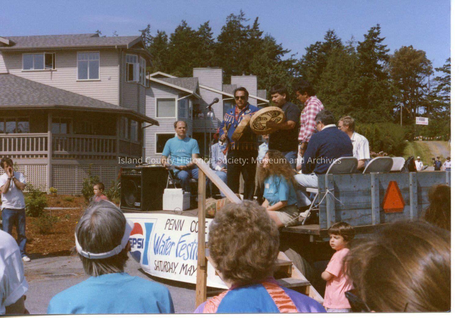 Coupeville Water Festival, 1992. Color photo. A group of men and a woman are sitting on a raised platform. An amp for the mic is on the left. Three men standing at the mic, two are playing flat drums and probably singing or talking. A burlap bag is at their feet. The sign on the front: Penn Cove Water Festival Saturday, May 23. Visible: museum porch.Collection