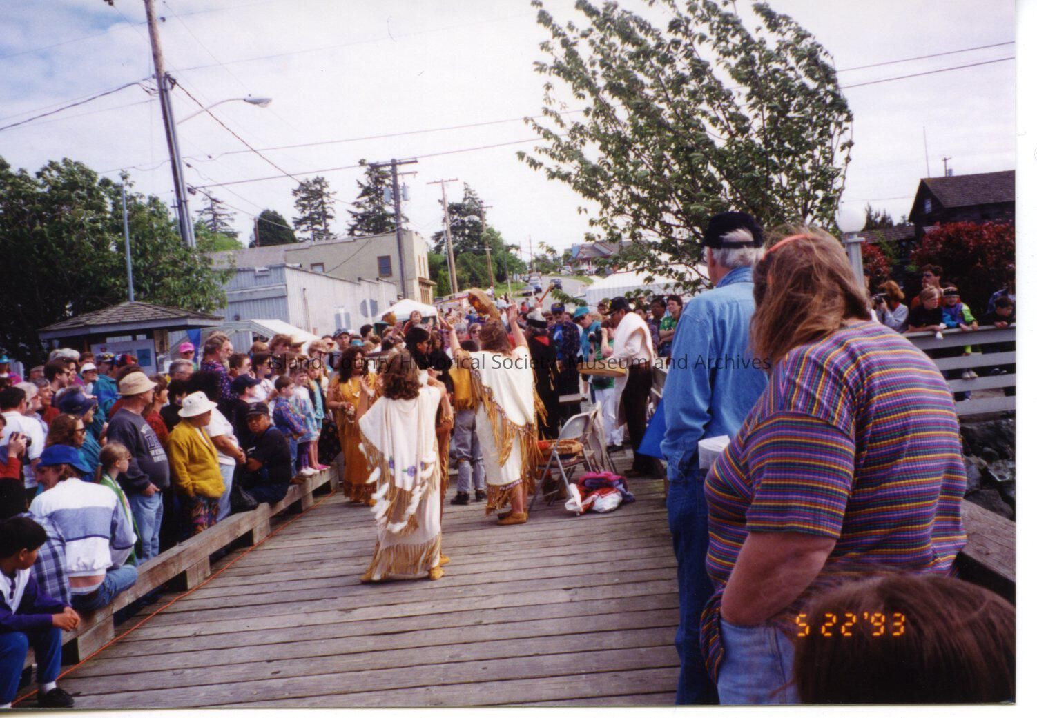 Coupeville Water Festival, 1993. Color photo, with date on the lower right. A group of men, women and children are watching Native American women dancing on the Coupeville wharf walkway.Collection