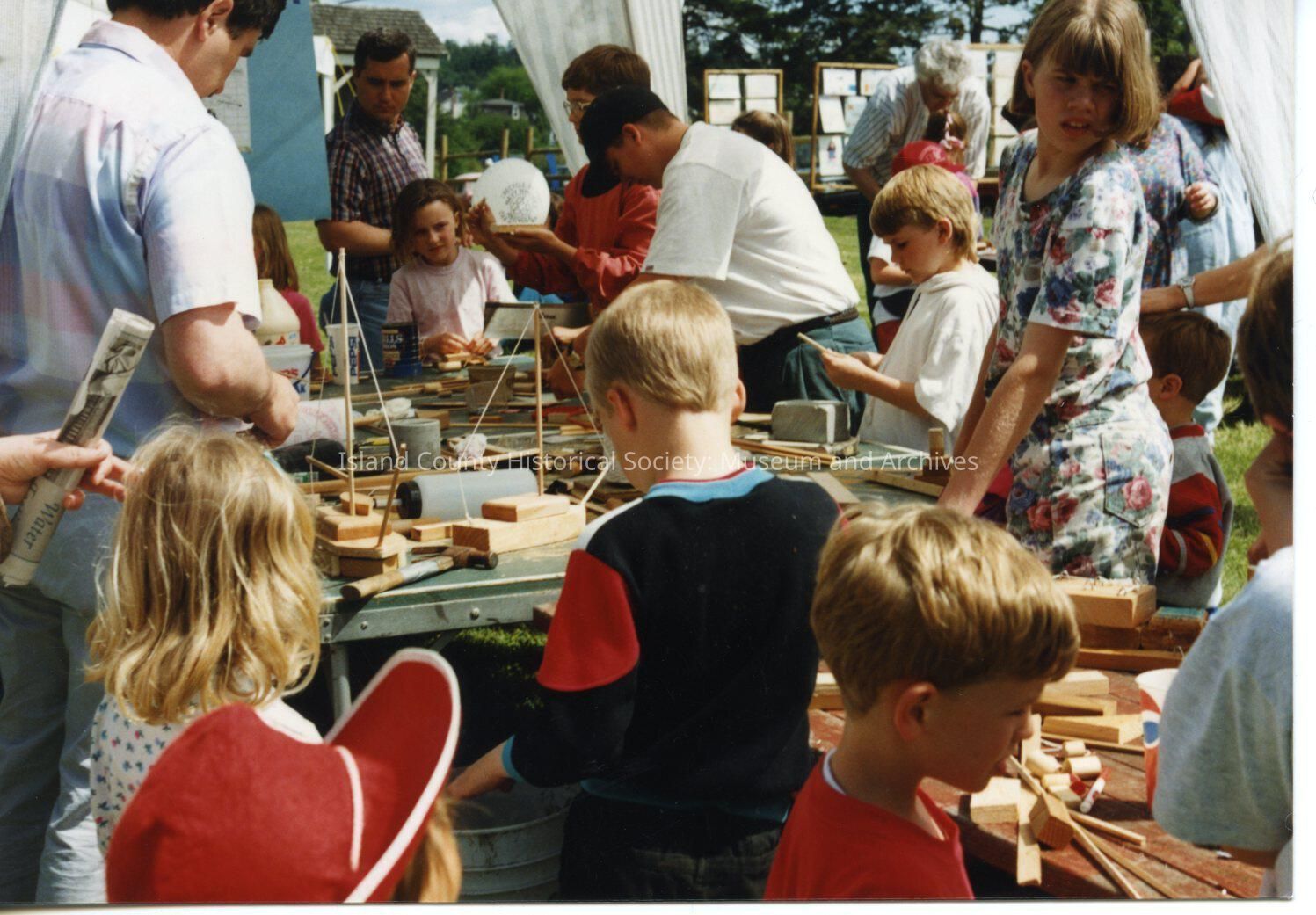 Coupeville Water Festival, 1992 or 1993. Color photo. A group of men, women and children are looking or holding items from vendor tables. Small pieces of wood and model sailboats are on the tables.Collection