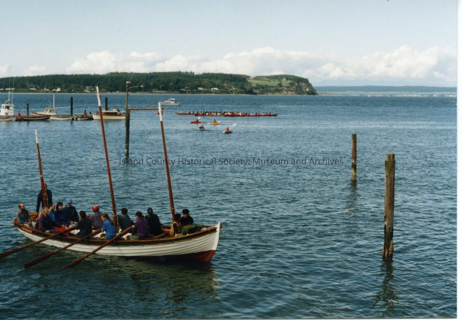 Coupeville Water Festival, 1993. Color photo. In the foreground is a wooden boat being rowed by men & women in Penn Cove. In the background are kayakers and native americans in native canoes. A portion of the warf is visible.Collection