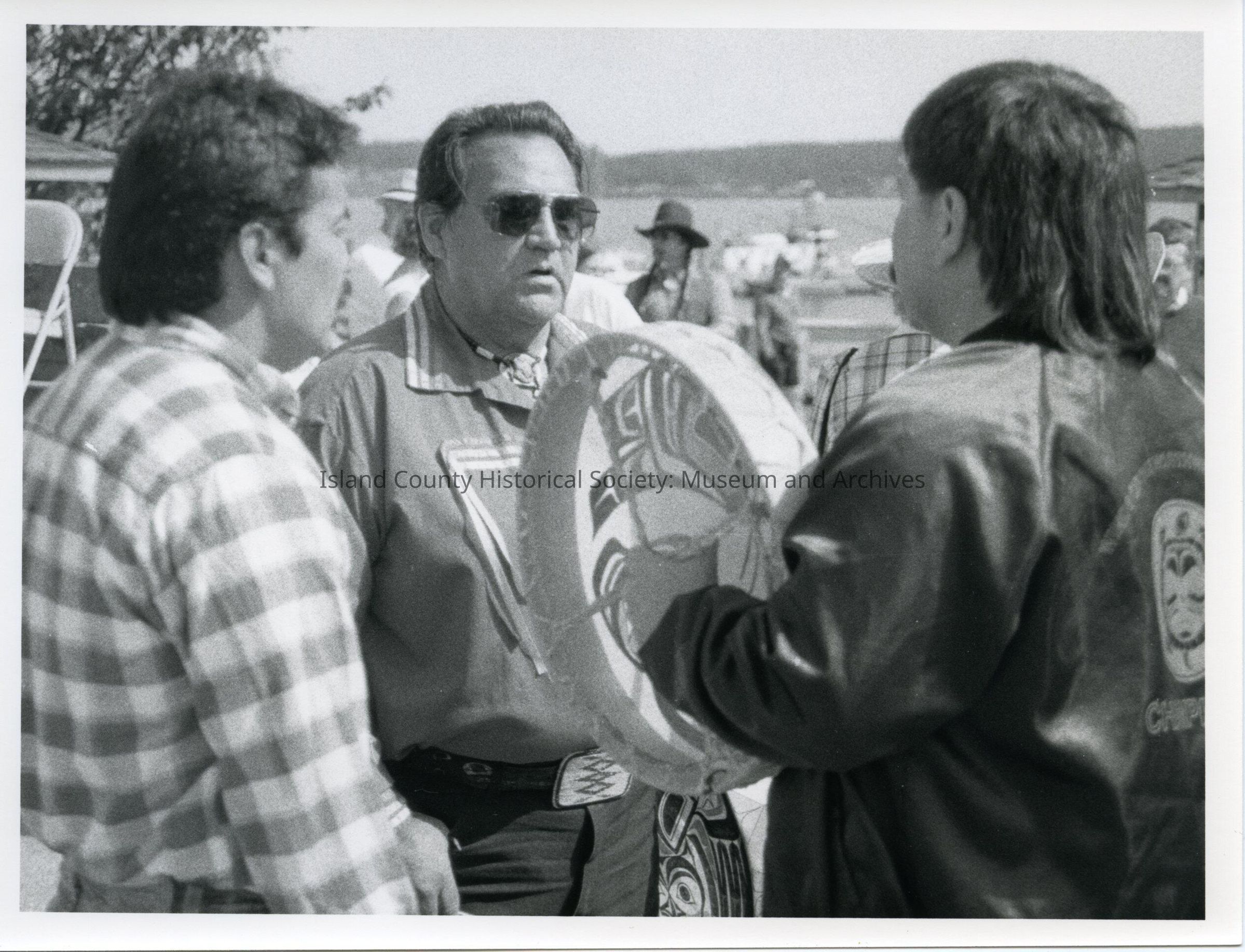 Coupeville Water Festival, 1992. Black and white photo. Three men are standing at Coupe Park near the water. One is holding a flat drum and jacket with a Native American turtle on the back. Another facing him has a decorated belt buckle. The other man is wearing a checked long-sleeved shirt. Boats are blurred in the background.Collection