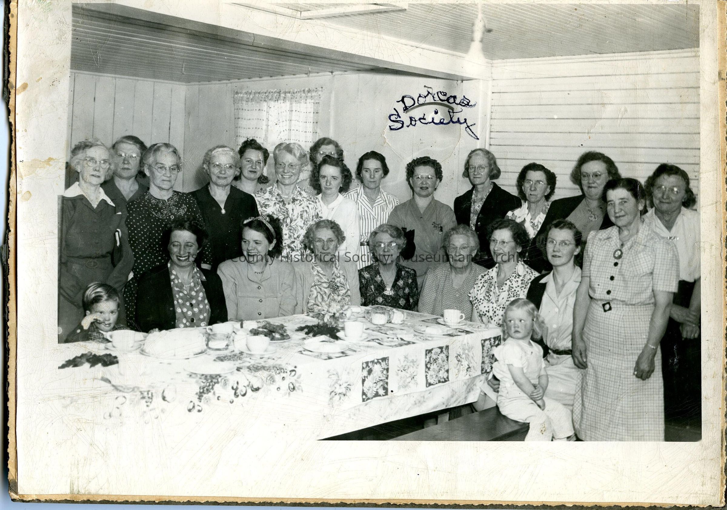 A large photo of women standing, and some sitting, at a table, inside a home. there are two children also. Handwritten on the front is "Dorcas Society." Handwritten on the back are all the names of the women. This photo is attached to a cardboard backing.Lexicon