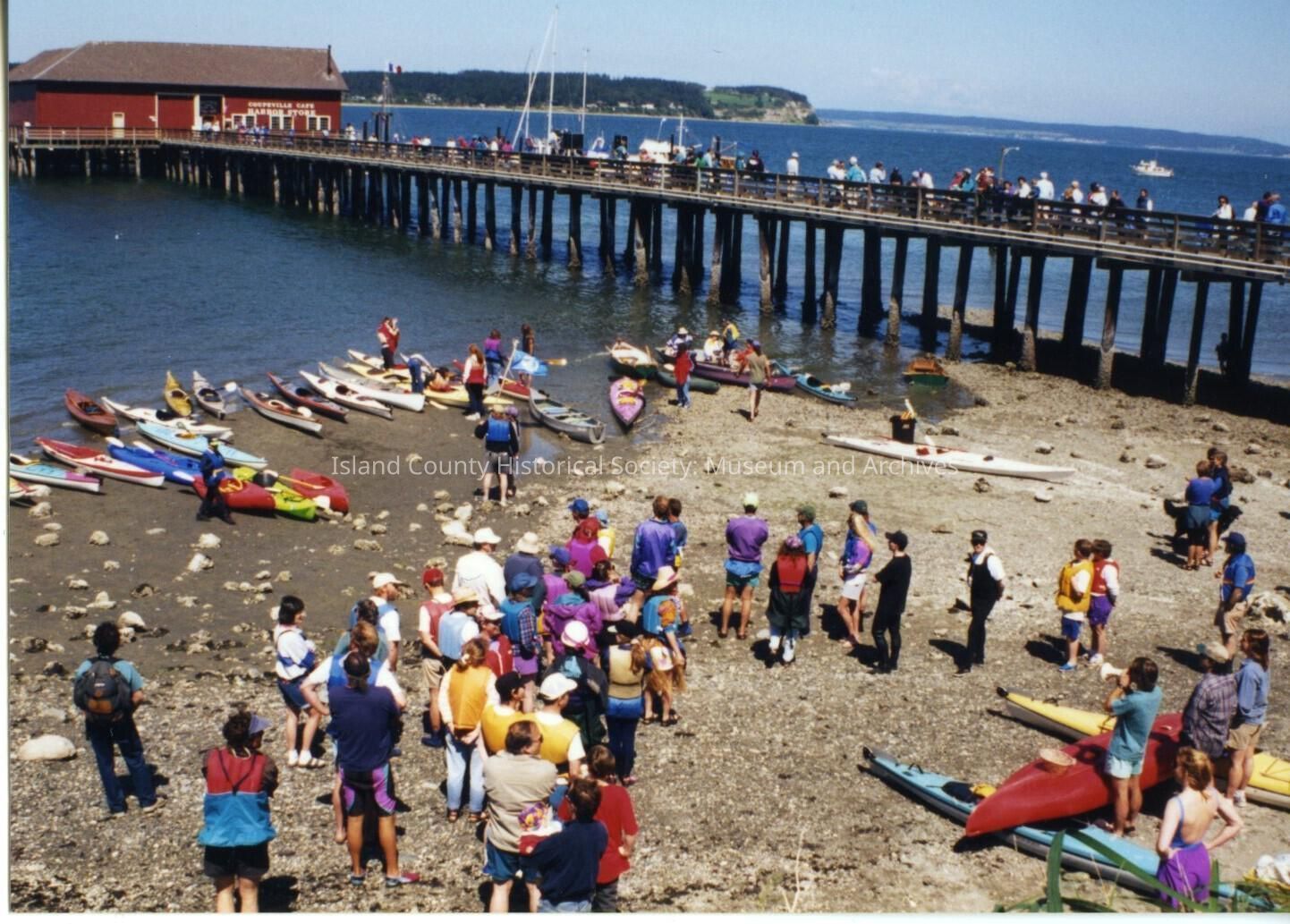 Coupeville Water Festival, 1993. Color photo. View from the shore on the west side of the wharf looking out toward the wharf. Numerous kayaks and bystanders are along the shore and on the wharf.