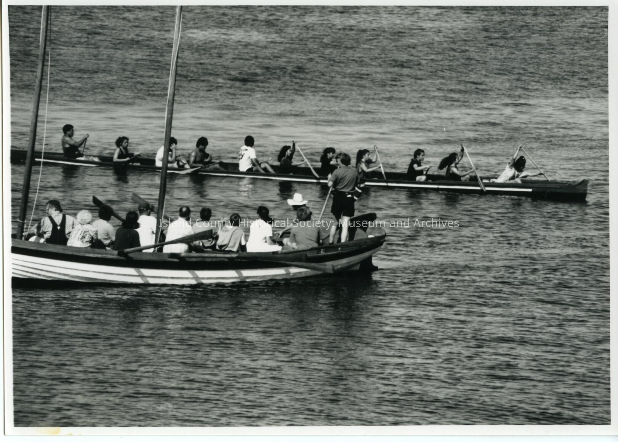 Coupeville Water Festival, maybe 1993. Black & white photo. View of an 11-person native canoe with boys & girls in Penn Cove. There is a wooden sailboat (sails are down) in the foreground being rowed by men and women.Collection