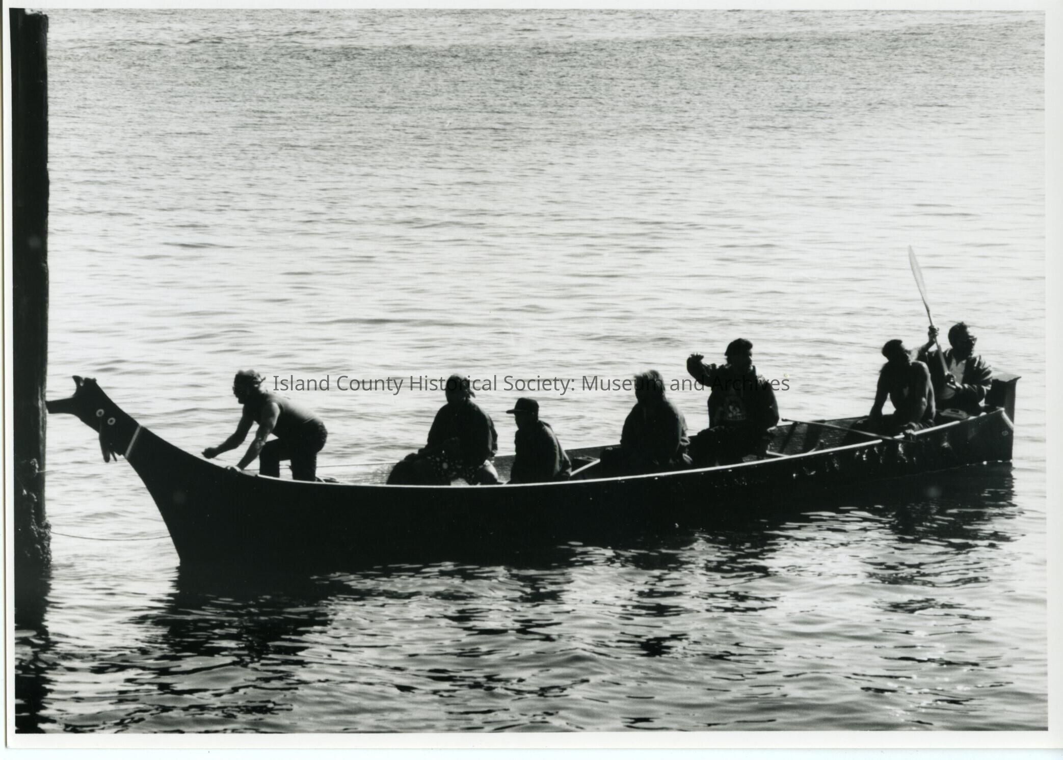 Coupeville Water Festival, maybe 1993. Black & white photo. Tulalip traditional canoe with seven men in Penn Cove. View is looking toward the port (left) side of the boat.