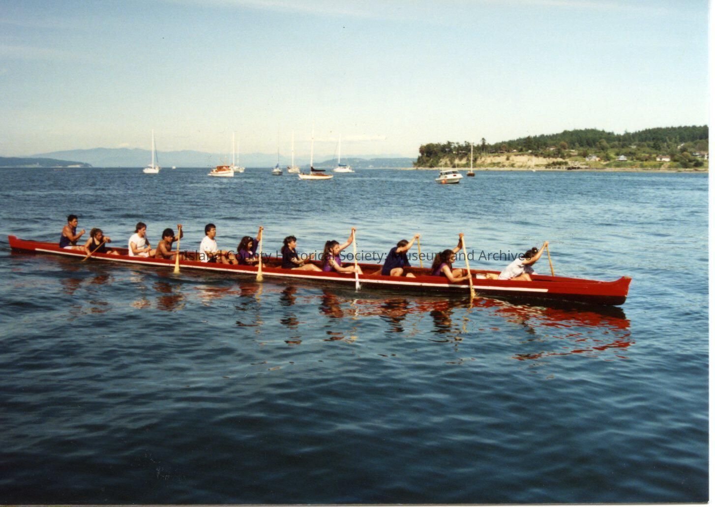 Coupeville Water Festival, 1993. Color photo. Native red canoe with eleven boys and girls racing in Penn Cove. The view is from the wharf looking east into Penn Cove.