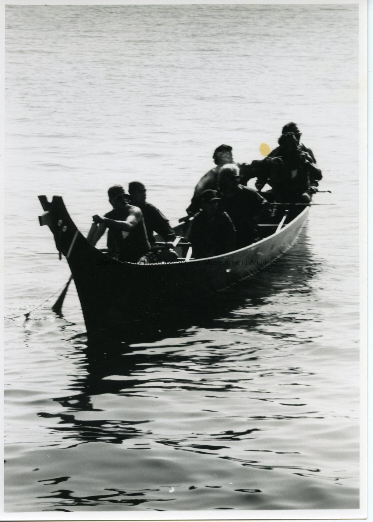 Coupeville Water Festival, maybe 1993. Black & white photo. Tulalip traditional canoe with seven men in Penn Cove. View is looking toward the bow and port (left) side of the boat.