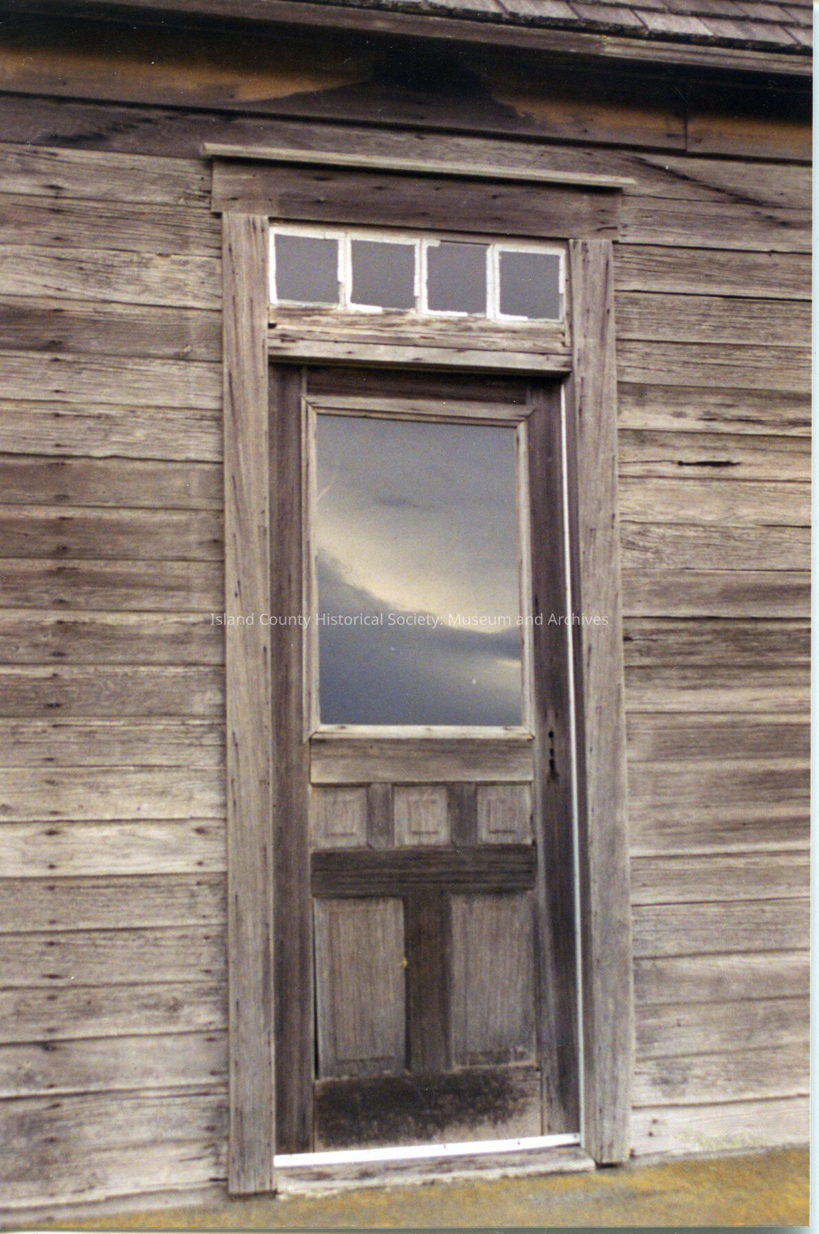 Outside view of Jacob Ebey House. Saltbox Residence. Wood frame set on wood post/concrete block foundation: rectangle (20'x32'). Image shows the front door to the house. The door has a window place in the top half. Also, above the door is another window that is comprised of four squares. Door is also missing it's handle.