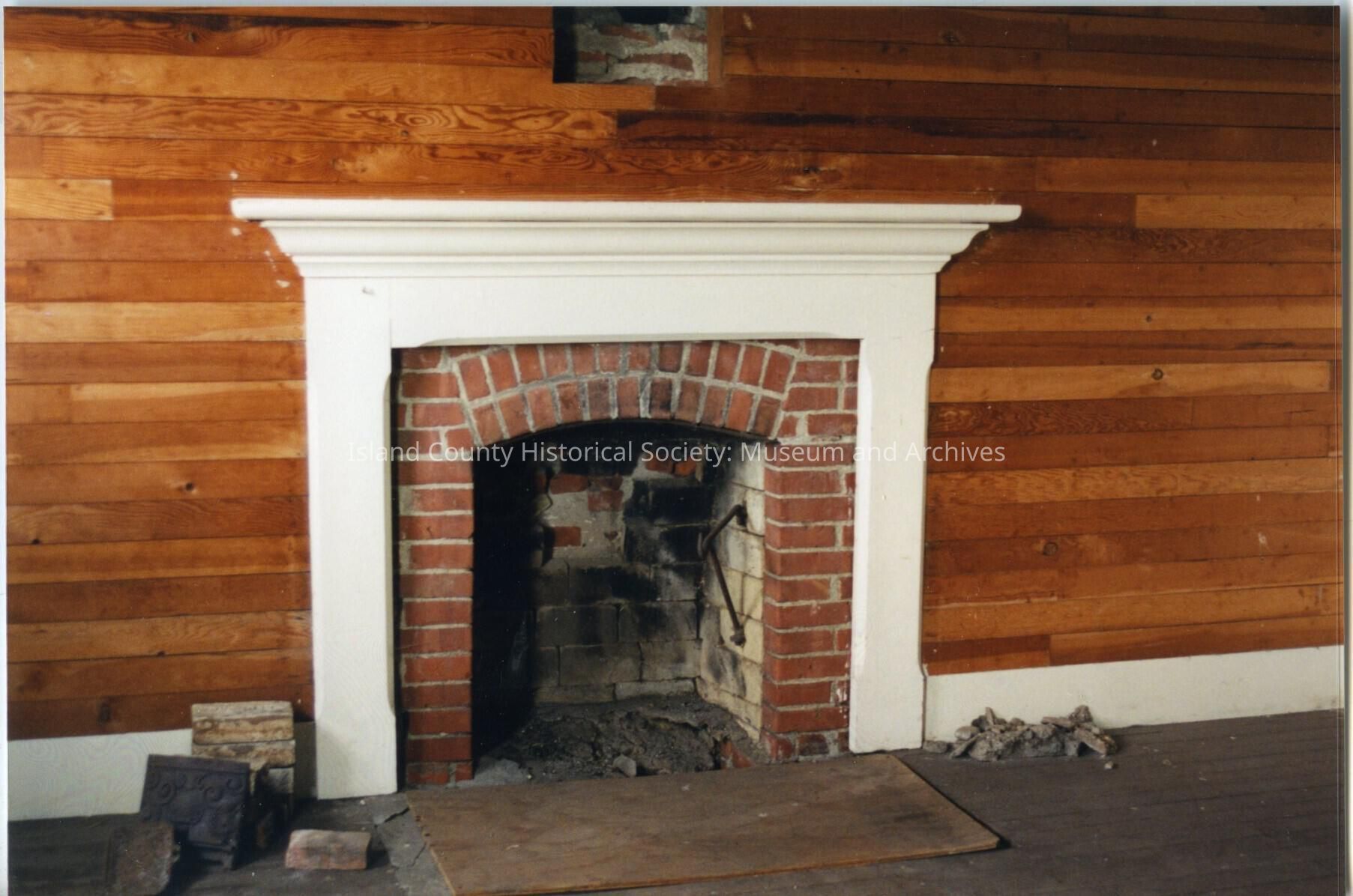 Inside view of Jacob Ebey House. Saltbox Residence. Wood frame set on wood post/concrete block foundation: rectangle (20'x32'). Image shows an inside view of the Ebey house. In the center of the room is a fireplace that has a brick hearth and white mantle. Next to the fireplace is firewood. The wall on either side of the fireplace is wood paneling.