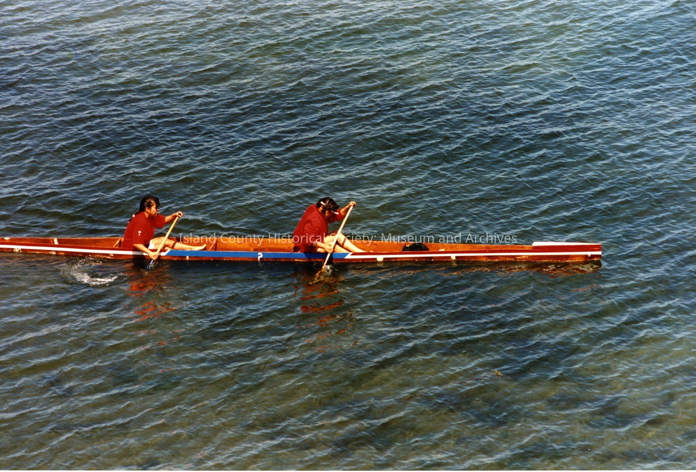Coupeville Water Festival, year unknown. Color photo. Closeup of a native two-person canoe racing on Penn Cove. The canoe has a red, white & blue gunnel and is being paddled by two girls in red shirts.Collection