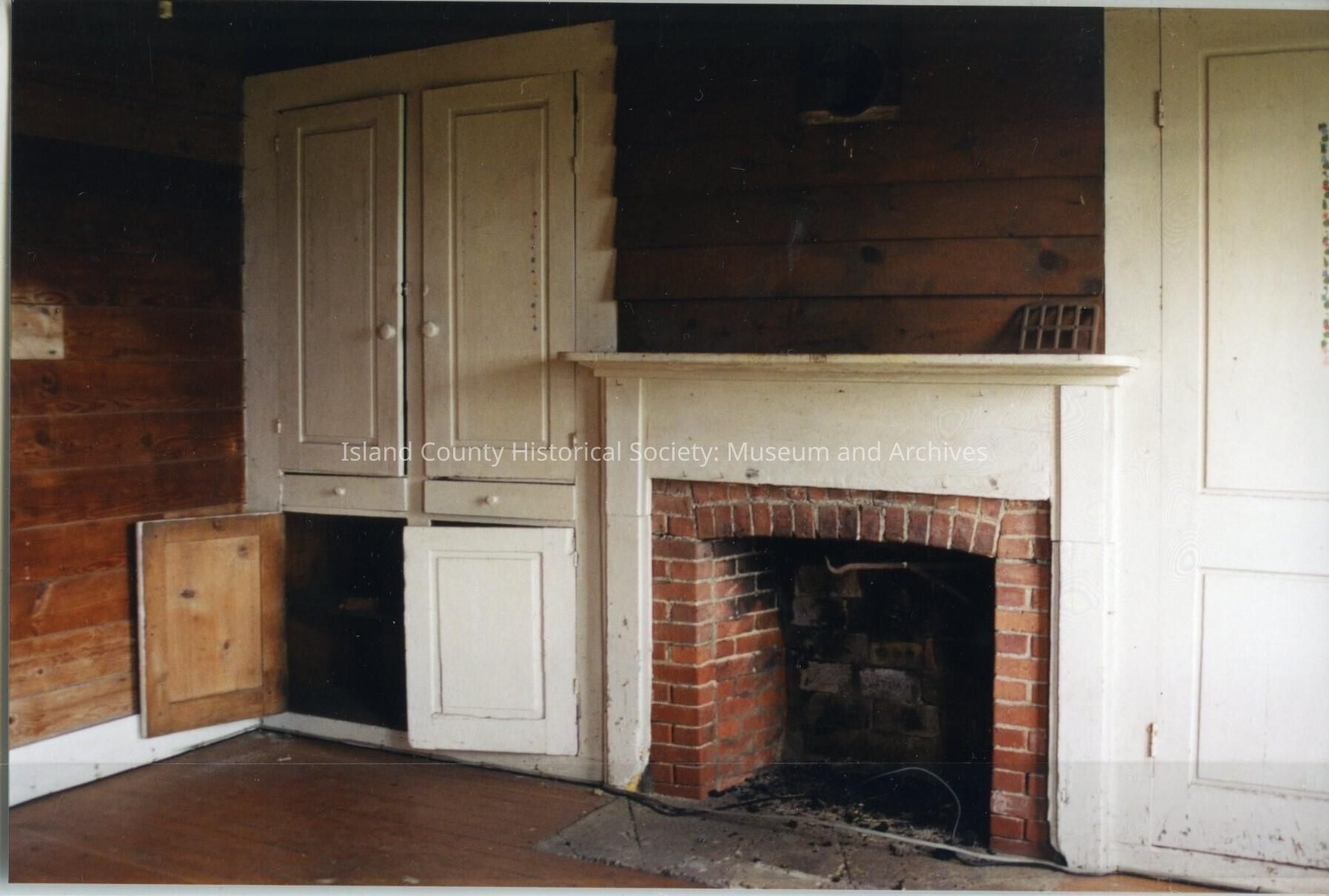 Inside view of Jacob Ebey House. Saltbox Residence. Wood frame set on wood post/concrete block foundation: rectangle (20'x32'). Image shows an inside view of the Ebey house. In the center of the room is a fireplace that has a brick hearth and white mantle. Next to the fire place is cabinet storage that has been opened to show the inside. Also, on top the mantle is what appears to be some sort of grate.