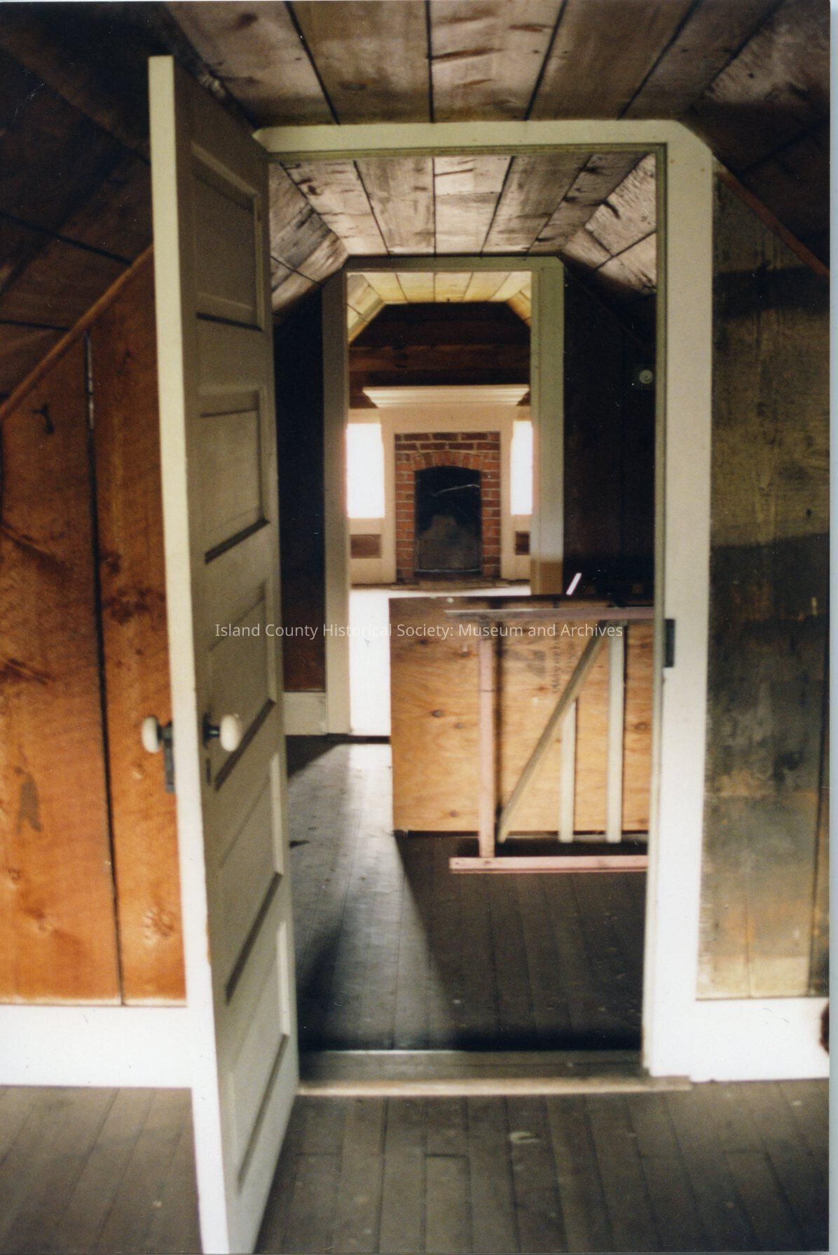 Inside view of Jacob Ebey House. Saltbox Residence. Wood frame set on wood post/concrete block foundation: rectangle (20'x32'). Image shows an inside view of the Ebey house. The view is of the second floor of the house. From one room we are looking into the room on the opposite side of the house. In the opposite side of the house is a room that has a fireplace with windows on either side. Also, in between the two rooms is a trap door that accesses the second floor.
