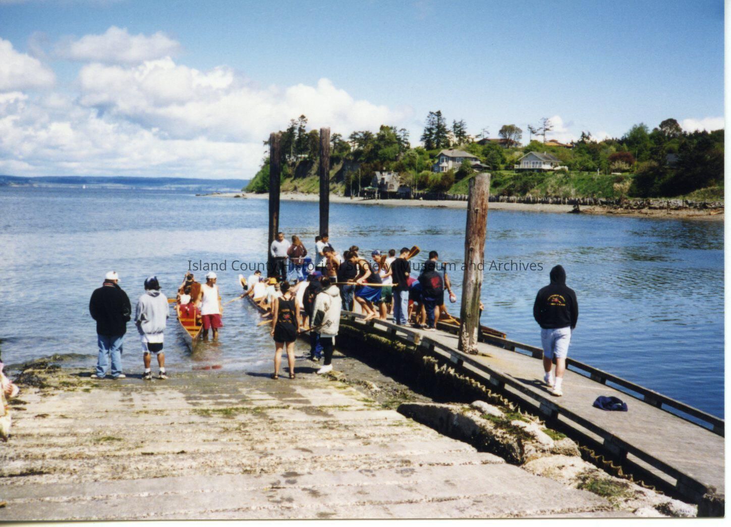 Coupeville Water Festival, 1999. Color photo. View of native canoes being launched at the Coupeville town boat ramp. Boys and girls are shown on the dock and in the canoes.