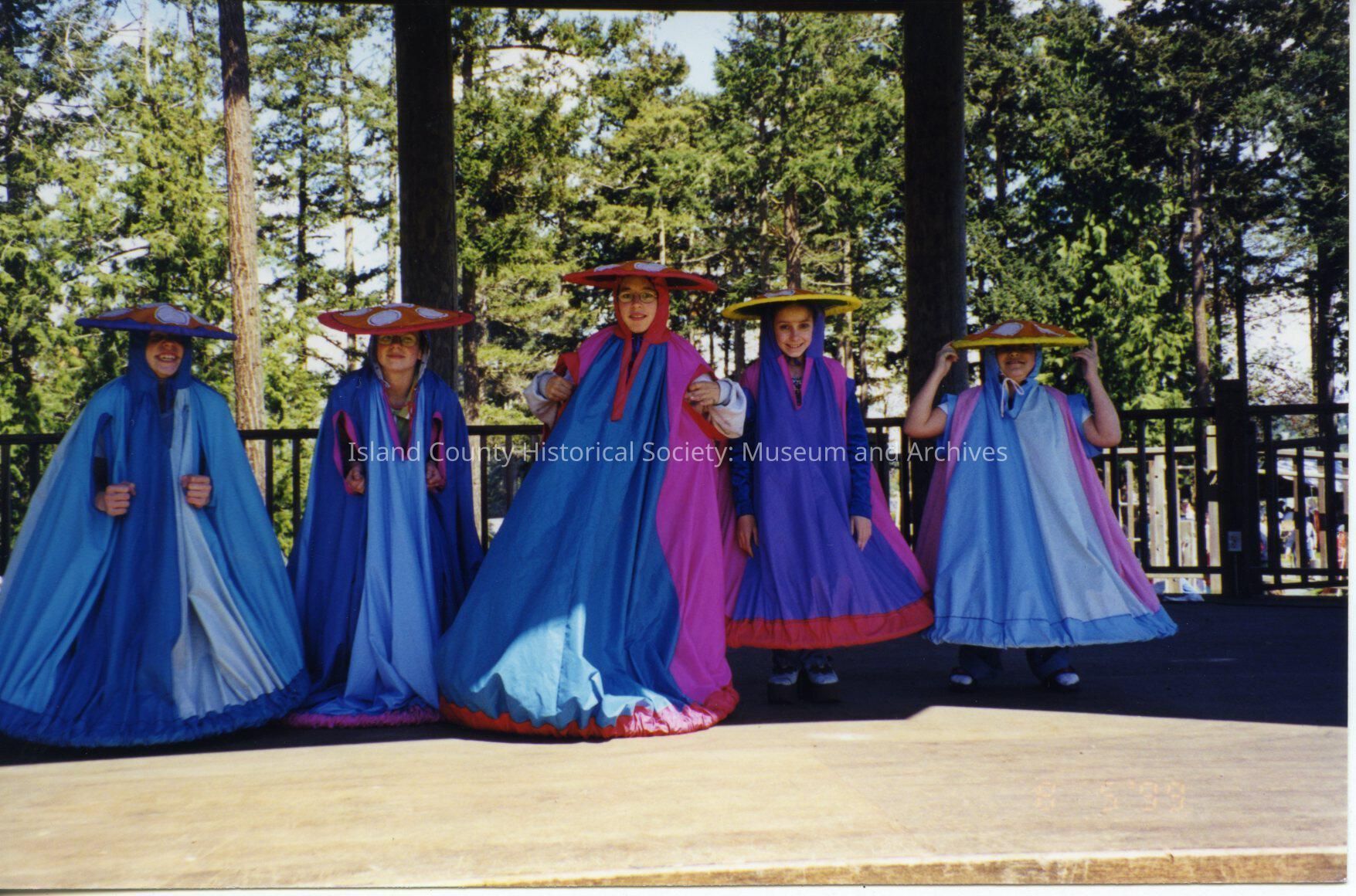 Coupeville Water Festival, 1995. Color photo. View of five women in costumes performing on the stage in Coupeville Town Park. The women are dressed in multicolored blue/pink/purple floor length flowing garments with hoops in the hems to make them stick out. Each woman is wearing a large, round, flat and brightly colored hat.Collection