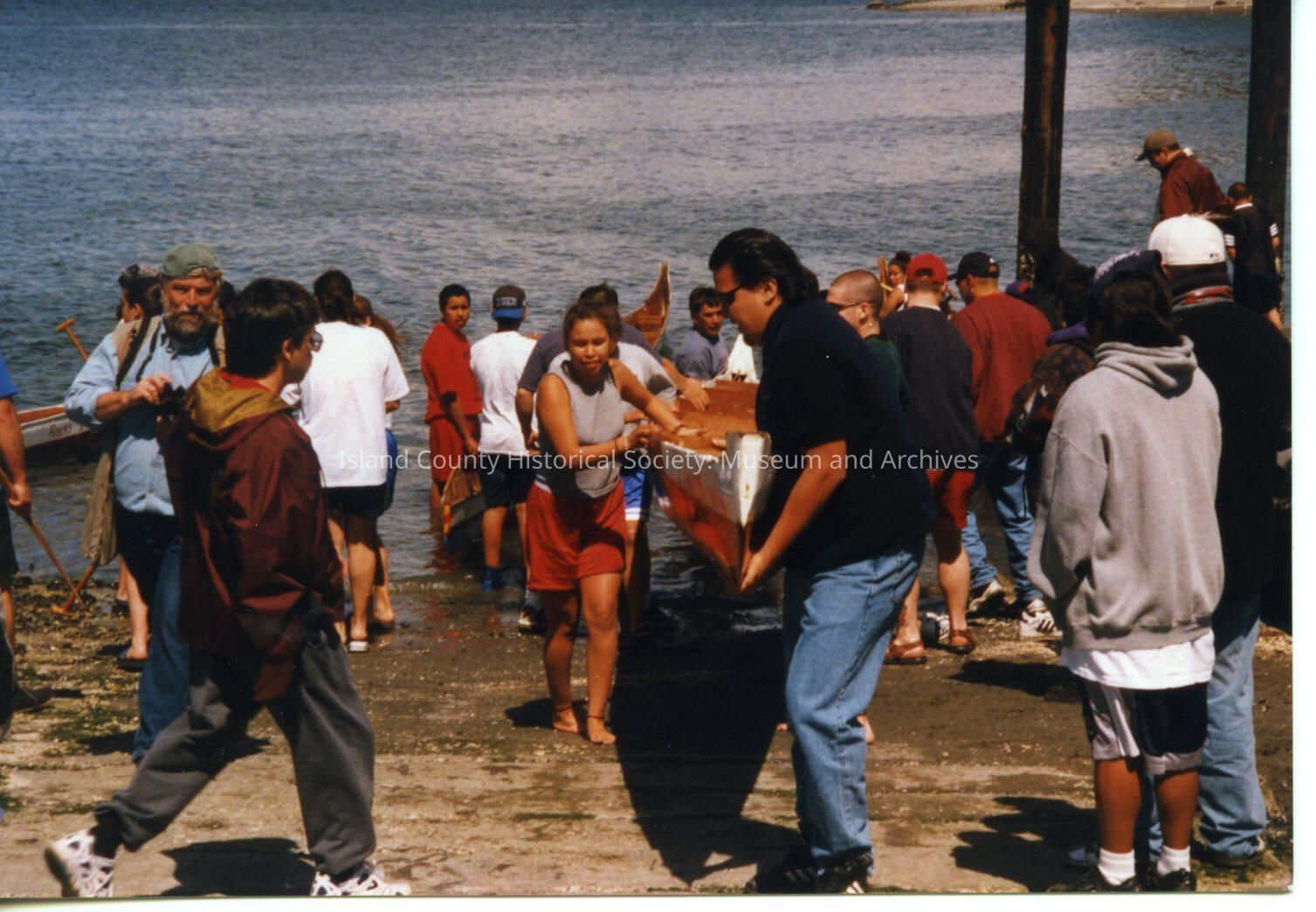 Coupeville Water Festival, 1999. Color photo. View of a native canoe being hauled out at the Coupeville town boat ramp. A man in jeans and a dark polo shirt is at the bow and a girl in a gray sleeveless top and red shorts is on the side of the canoe. Numerous other people are on the boat ramp.Collection
