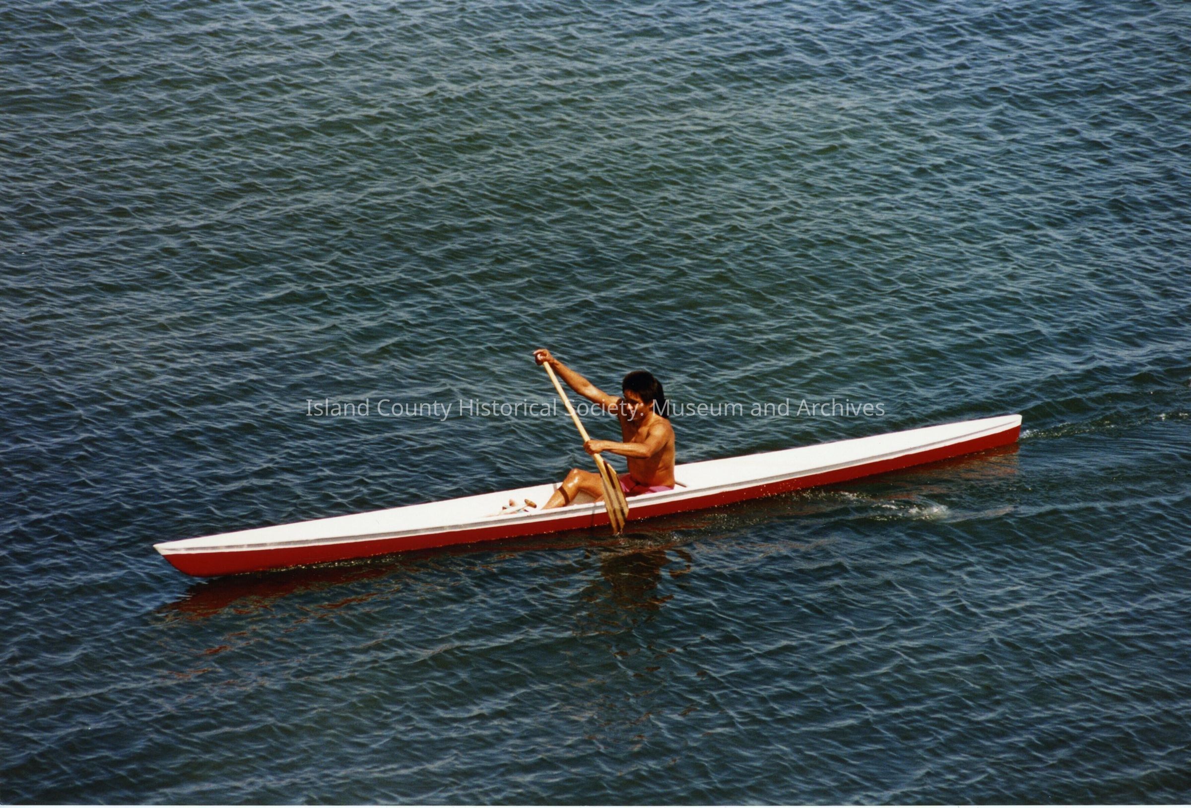Coupeville Water Festival, year unknown. Color photo. Closeup of a native one-person canoe racing on Penn Cove. The canoe has a red and is being paddled by a barechested boy.