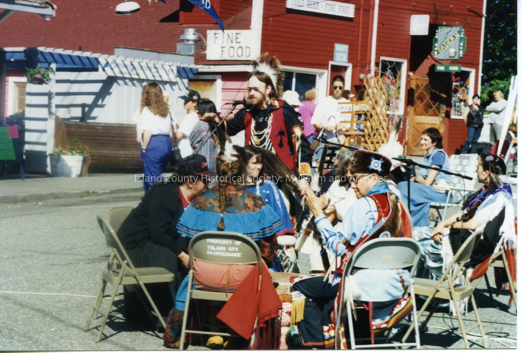 Coupeville Water Festival, 1995. Color photo. View of Native Americans in ceremonial costumes at the festival. A young man is speaking at the microphone. He is wearing a red vest and black shirt. Several women in native dress and a man are sitting in a circle in front of him. Toby's Tavern is in the background.Collection