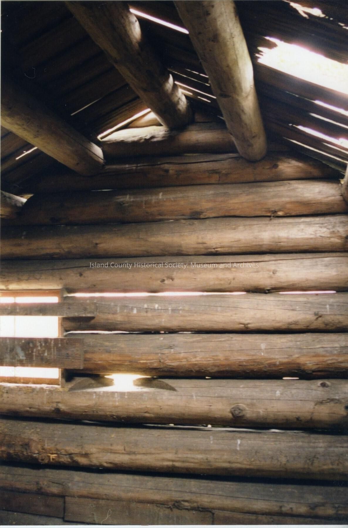 Inside view of Blockhouse on the Ebey house property. The picture is of one of the walls and ceilings of the blockhouse as well as one of the windows. The logs in the image seem to be in good condition.