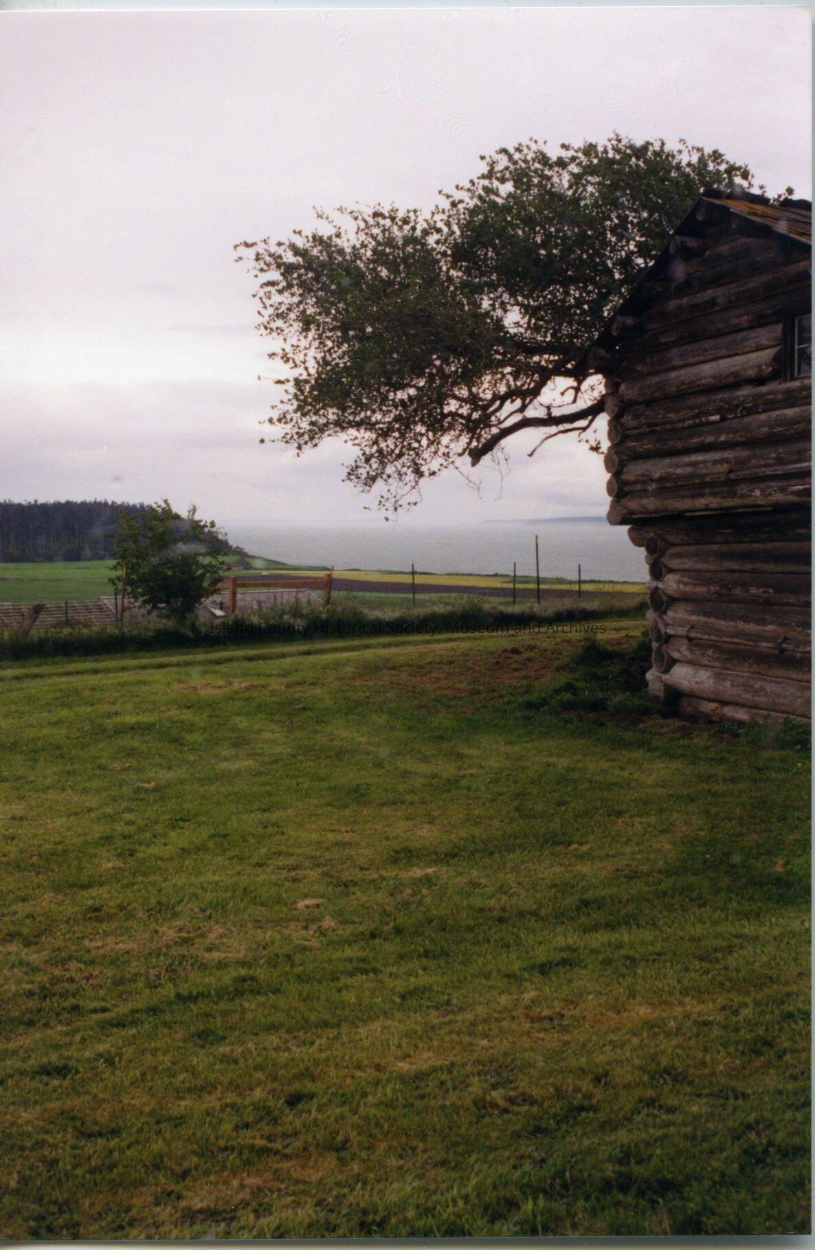 Outside view of Blockhouse on the Ebey house property. The picture shows part of the blockhouse on the right hand side where one window is barely visible. One can also see the wate in the background and the tree that is located close to the house.