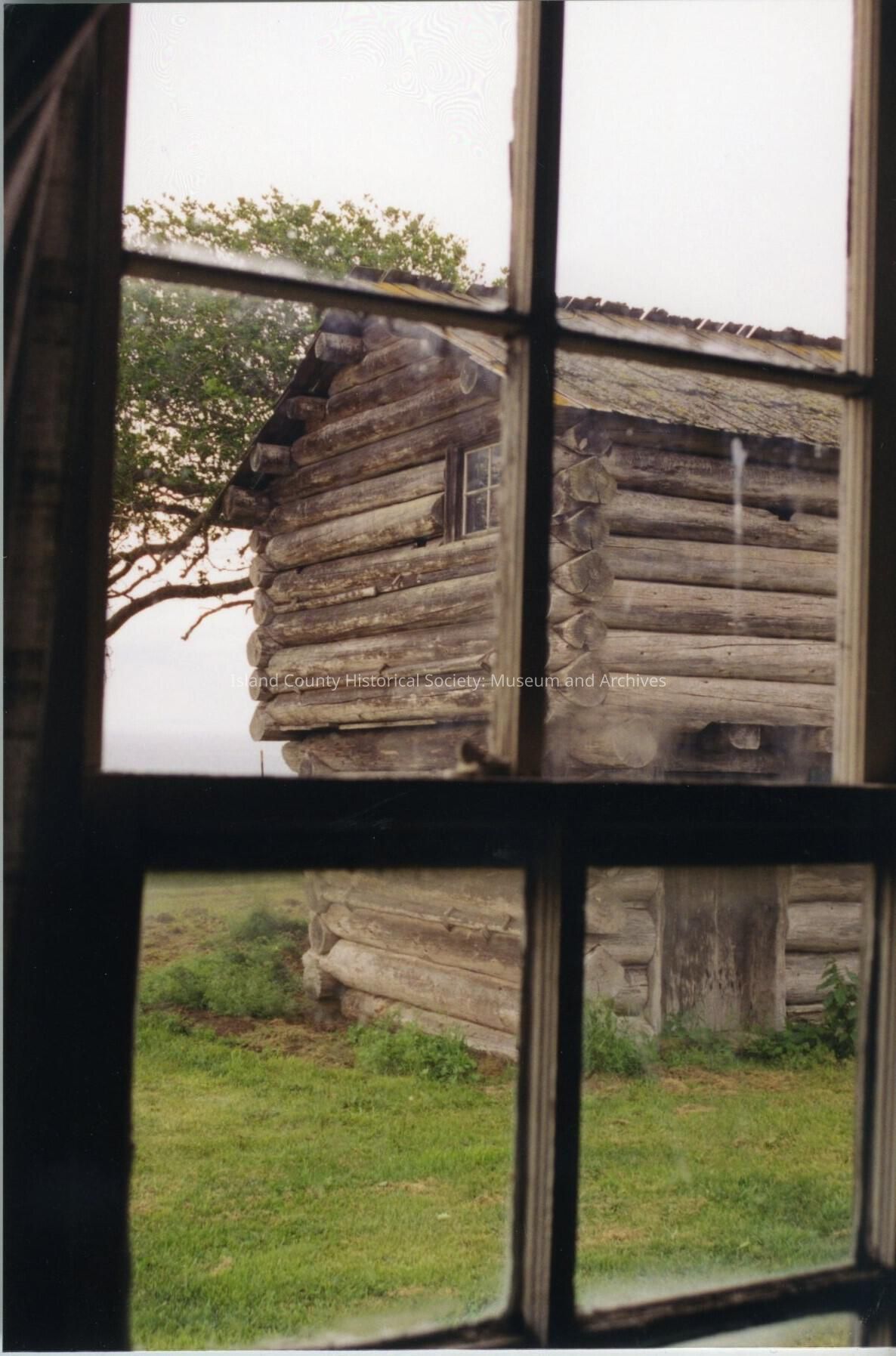 View of the blockhouse from the inside of the Ebey house. You can see the front entrance of the blockhouse as well as the second story window. Also in the picture you can see the tree that is located extremely close to the blockhouse.