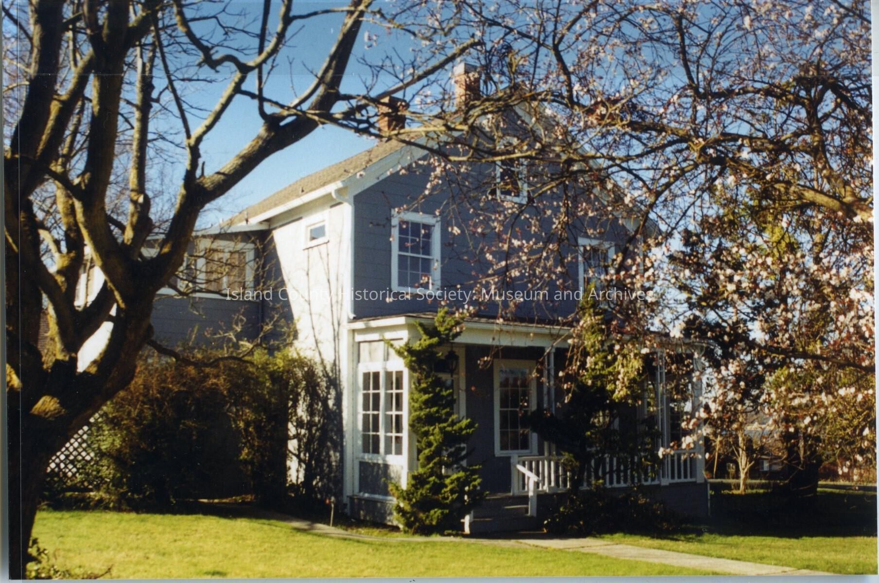 Outside view of the Alvah D. Blowers/Sewall House. In the image you can see the entrance of the house. In the foreground is two trees with the house standing in the background. Front of the house has a porch and many windows. There is also two chimneys visible. This house was built in 1874 for Alvin Blowers, a prominent businessman in the community. Blowers was a partner in Blowers & Kineth, president of Island County Bank, and held several positions in local government. The house has been remodeled over the years with the back porch and second story porch on the sound facade being enclosed, but view changes have been made to the front facade. During the 1920's, Dr. Marxim maintained both his office and residence in the building making alterations to the interior.Made/Created