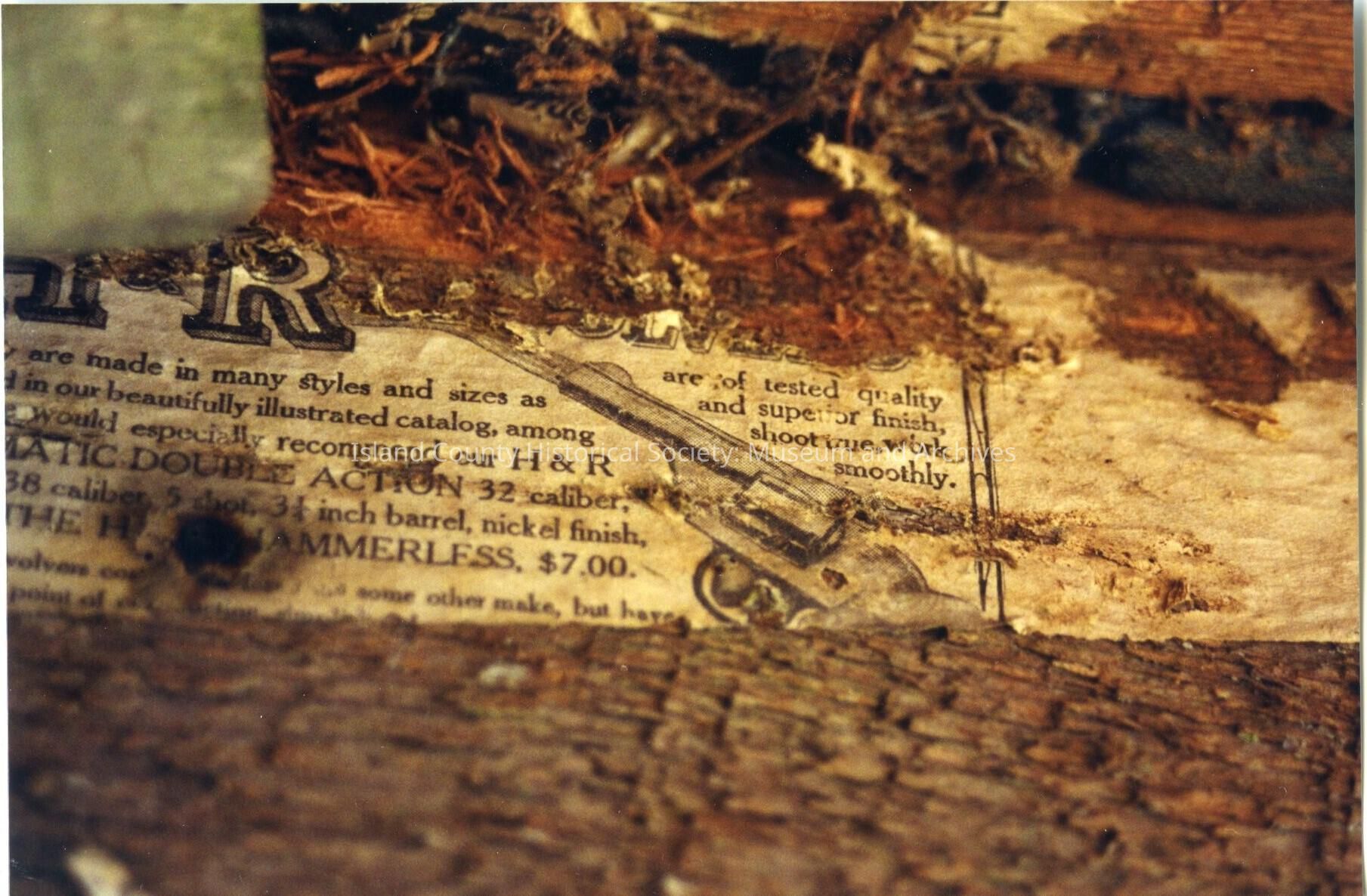 Chinese Tenant Farmer House. Inside view. The image shows a newspaper clipping that has been plastered on the inside wall of the house. Visible in the clipping is an advertisement for a H & R automatic double action 32 caliber gun. Around the advertisement is some outside debris. The site adress is the North side of West Hill Roaad, across from large red barn.