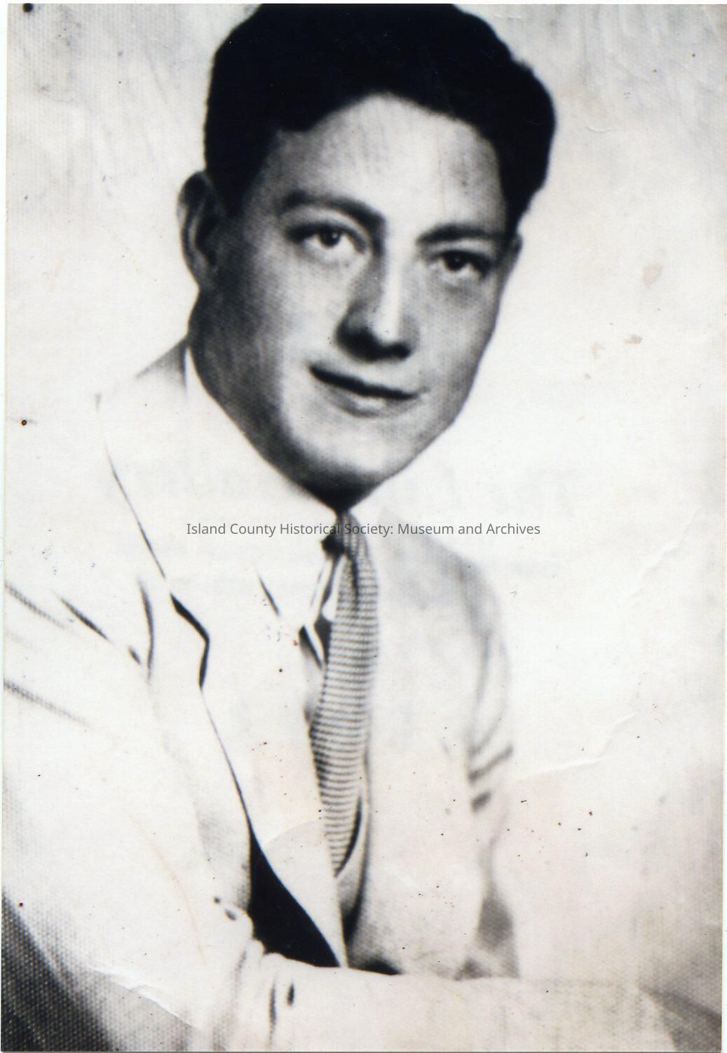 Photo of a man in a suit and ribbed tie. It looks like a studio portrait. On the back: Vic Sealey, He owned Sealey's Tavern at 8 NW Front Street.