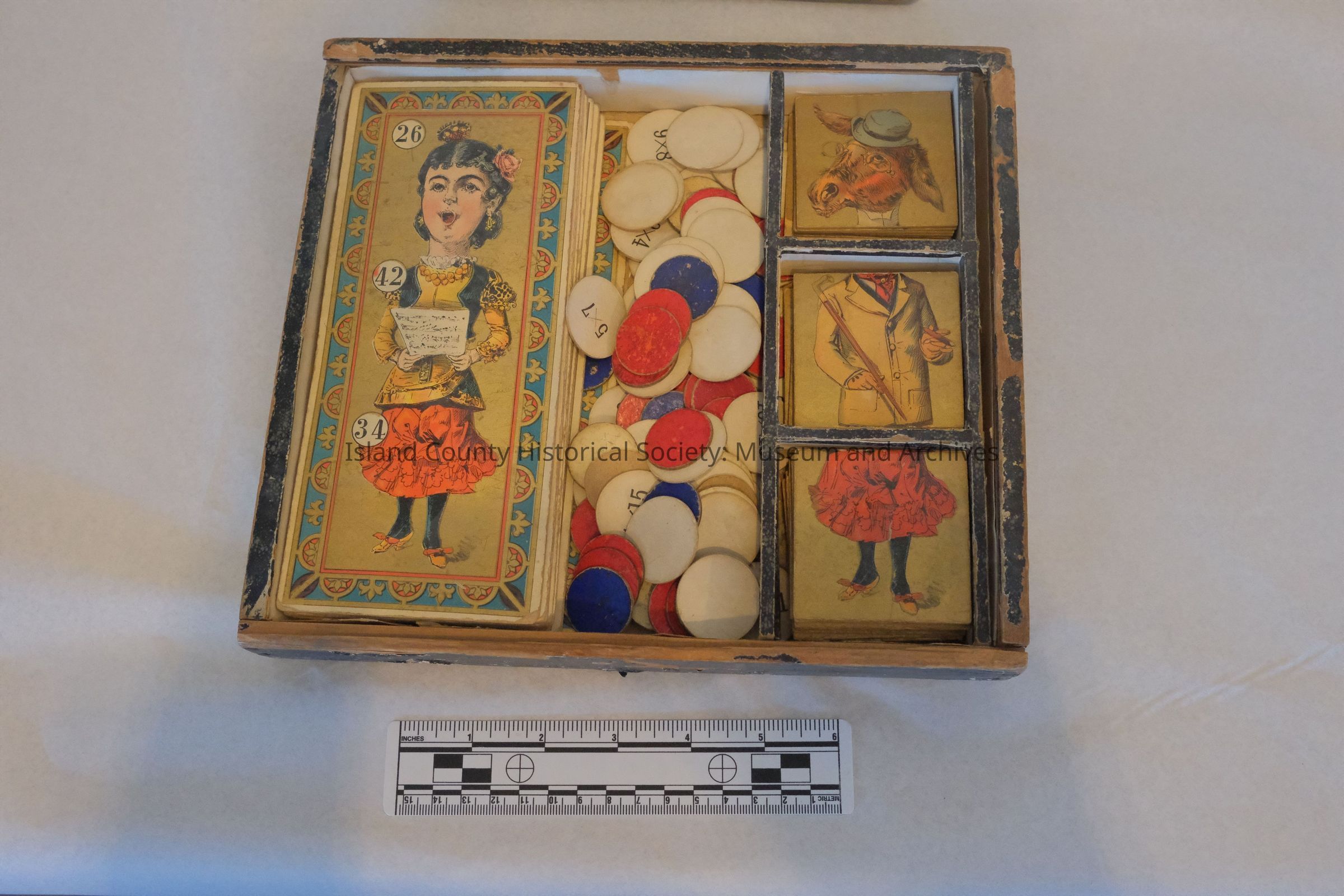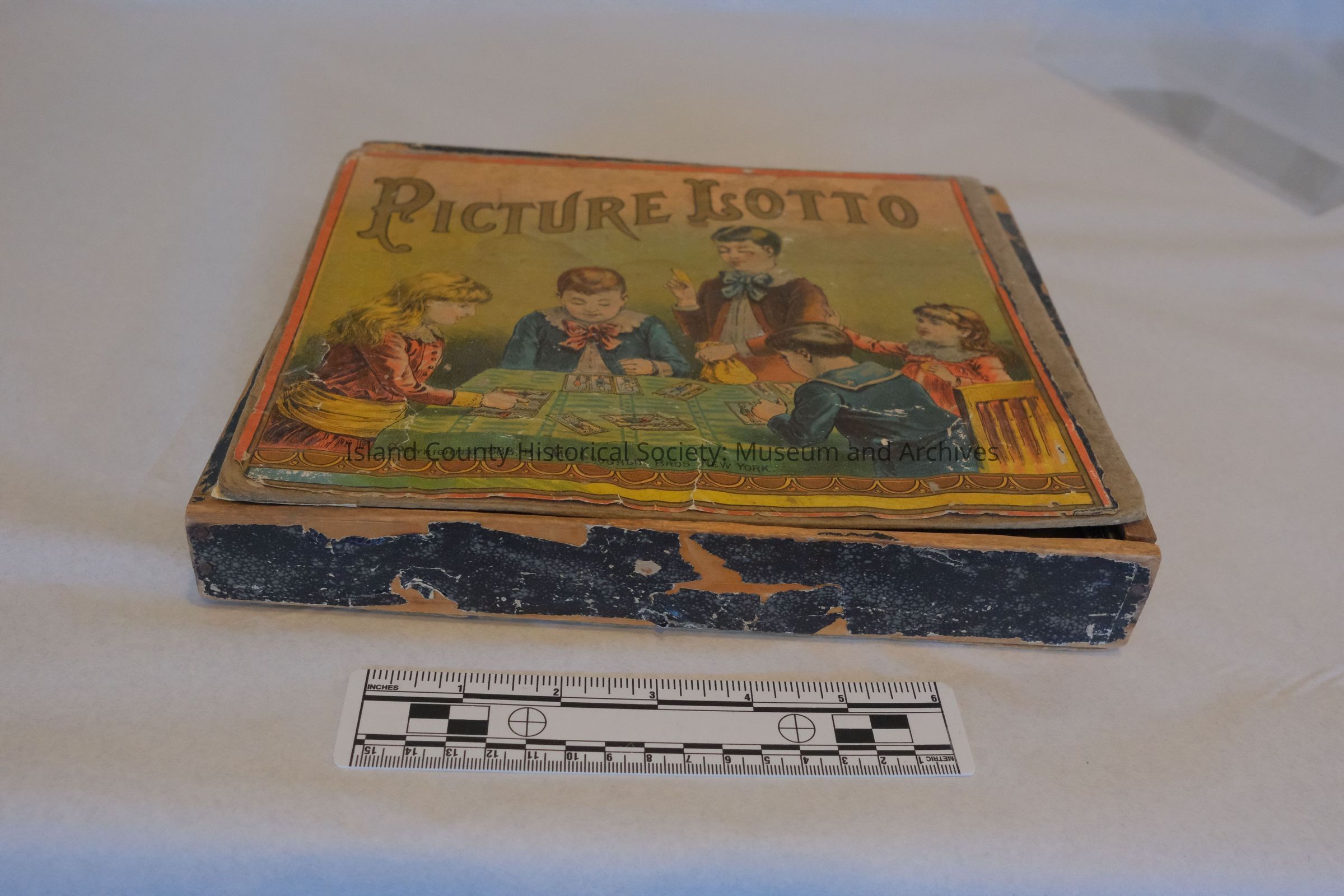A high-quality game made by McLoughlin Brothers of New York, "Picture Lotto" is packed in a wooden box with a sliding lid. The illustration on the lid shows children playing the game. Lotto became popular in America during the late 19th century as a children's game. This example, for young children, involved matching pieces of whole pictures to the appropriate space on a board showing the whole. Lotto games such as this led to the introduction and popularization of the game Bingo, popular today.
