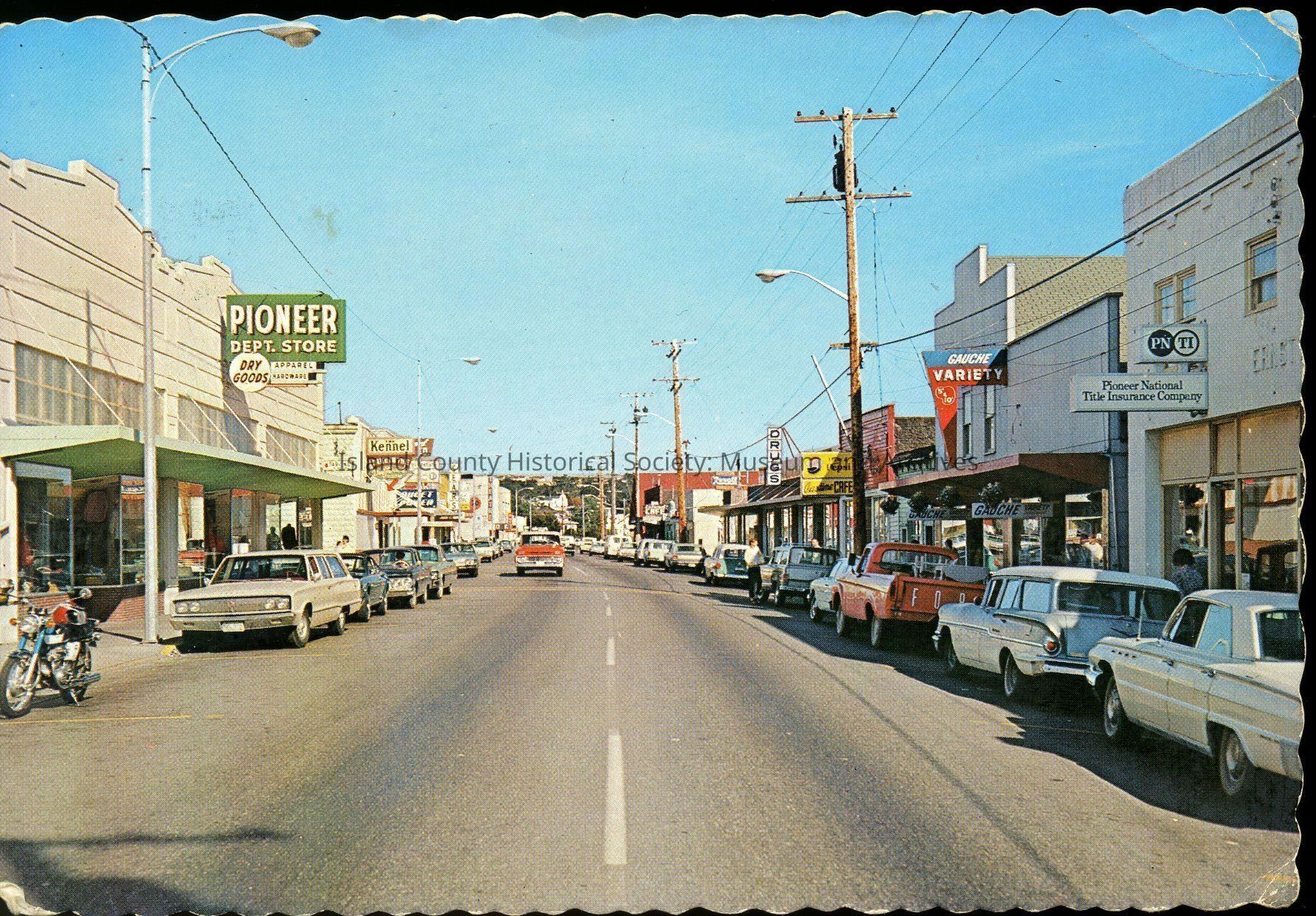 Postcard depicting Pioneer Way scene, c. 1960s. Text print on reverse reads, "Oak Harbor, Washington. This important Whidbey Island city is the home of AULT FIELD, an important navy air station. Ektachrome by Clifford B. Ellis."Collection