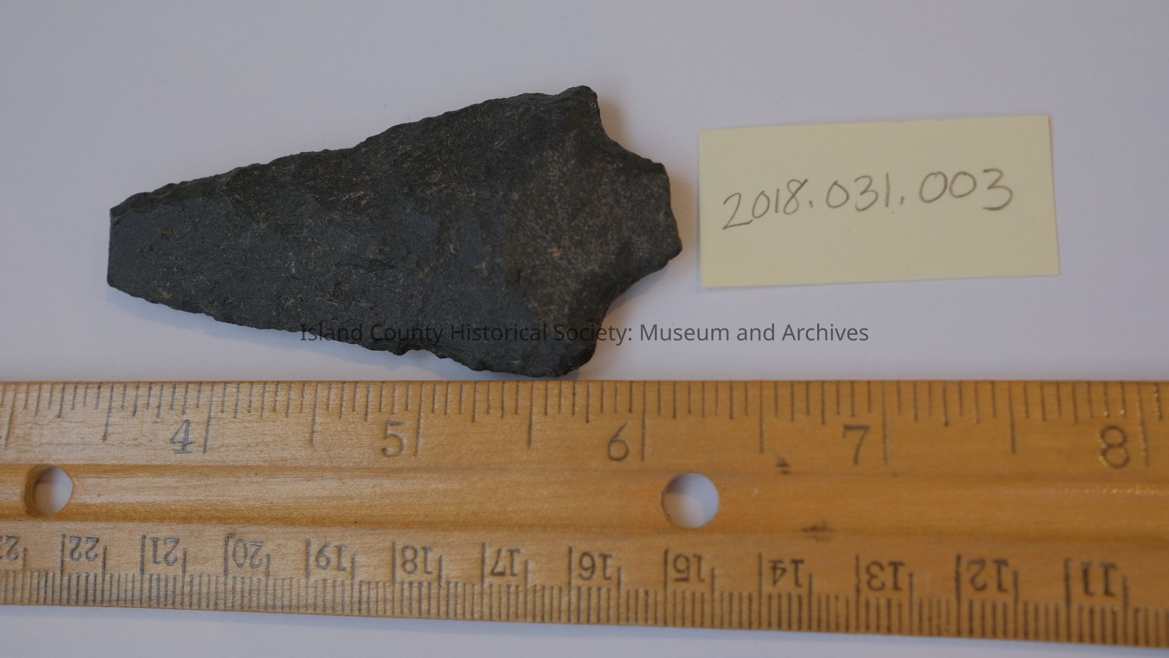 Stone projectile point, dark grey. Blade is rectangular in shape. Stem is contracting with rounded shoulders, base is flat but broken. Lenticular cross section. Tip is broken off.