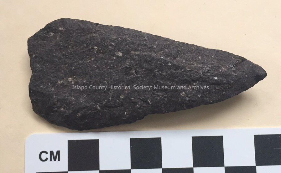 Stone projectile point, dark grey. Blade is triangular in shape. Base/Stem is broken off.