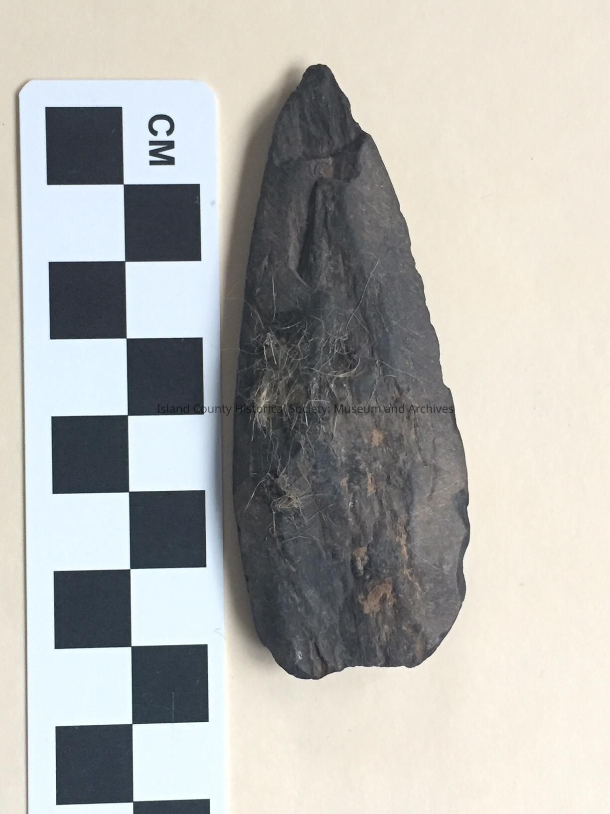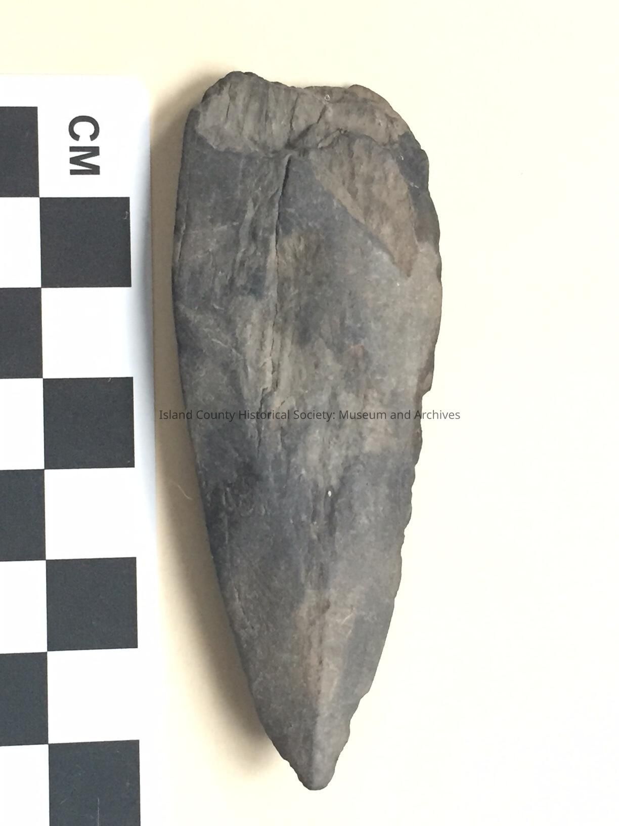 Stone projectile point, dark grey. Blade is ovate in shape. Base/Stem is damaged. One side contains some glue residue & fibers from canvas is was mounted on for display in collection.