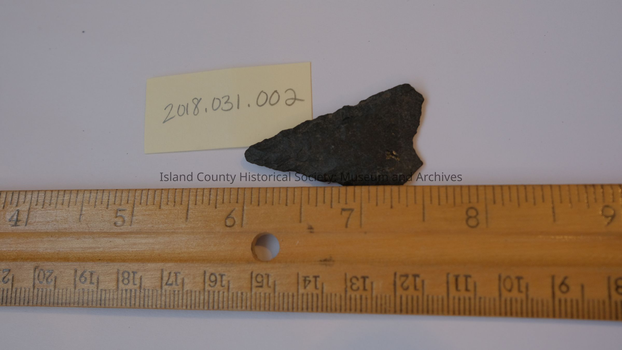 Stone projectile point, dark grey. Blade is triangular in shape, base is concave with broken shoulders likely rouned. Lenticular cross section.
