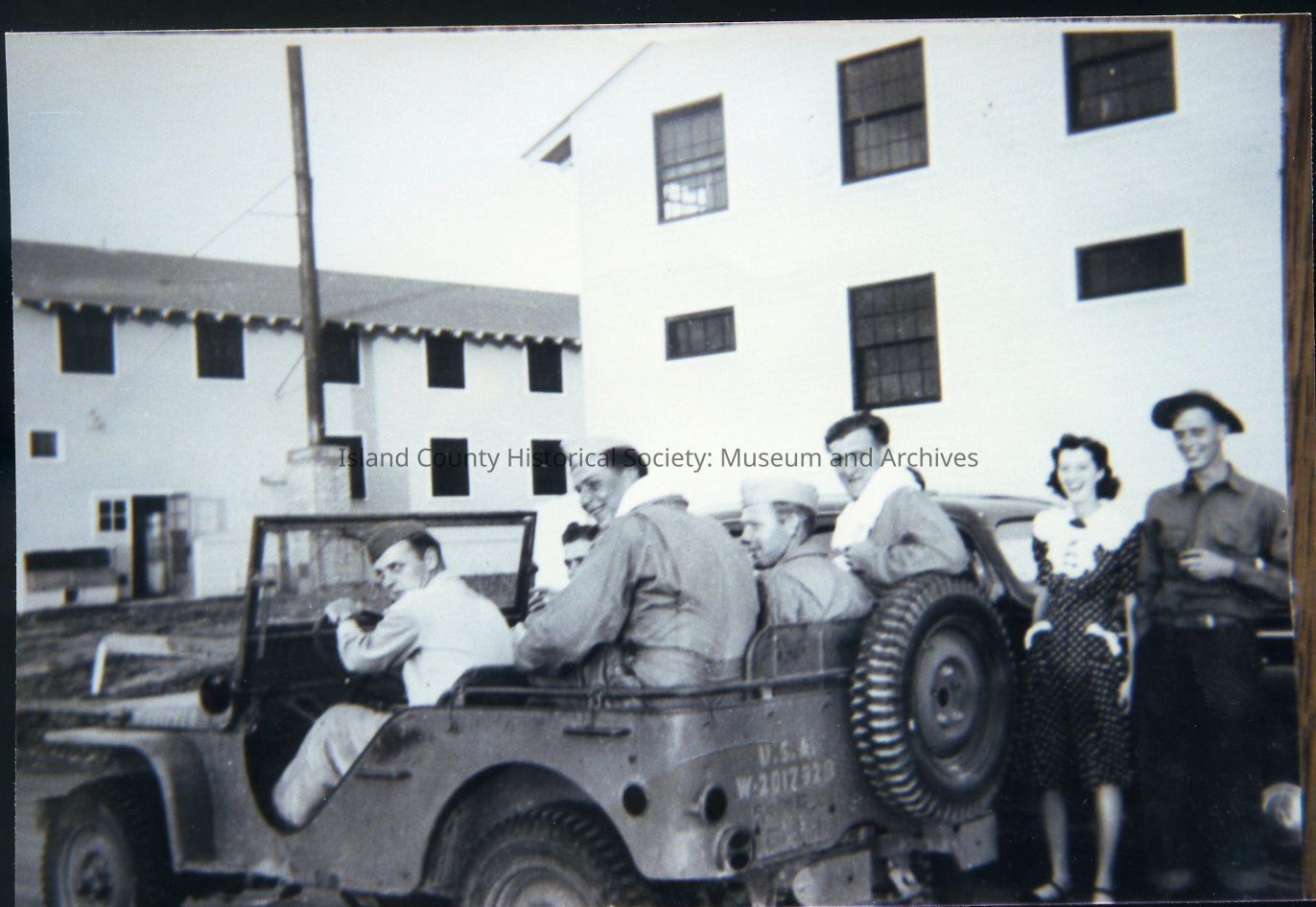 Photograph of a group of individuals posing for a photo at Fort Casey. Five individuals sit inside an open-top motor vehicle, while two lean against a different motor vehicle. This photo location is behind the Fort's barracks. C. 1940s.Photograph Details
