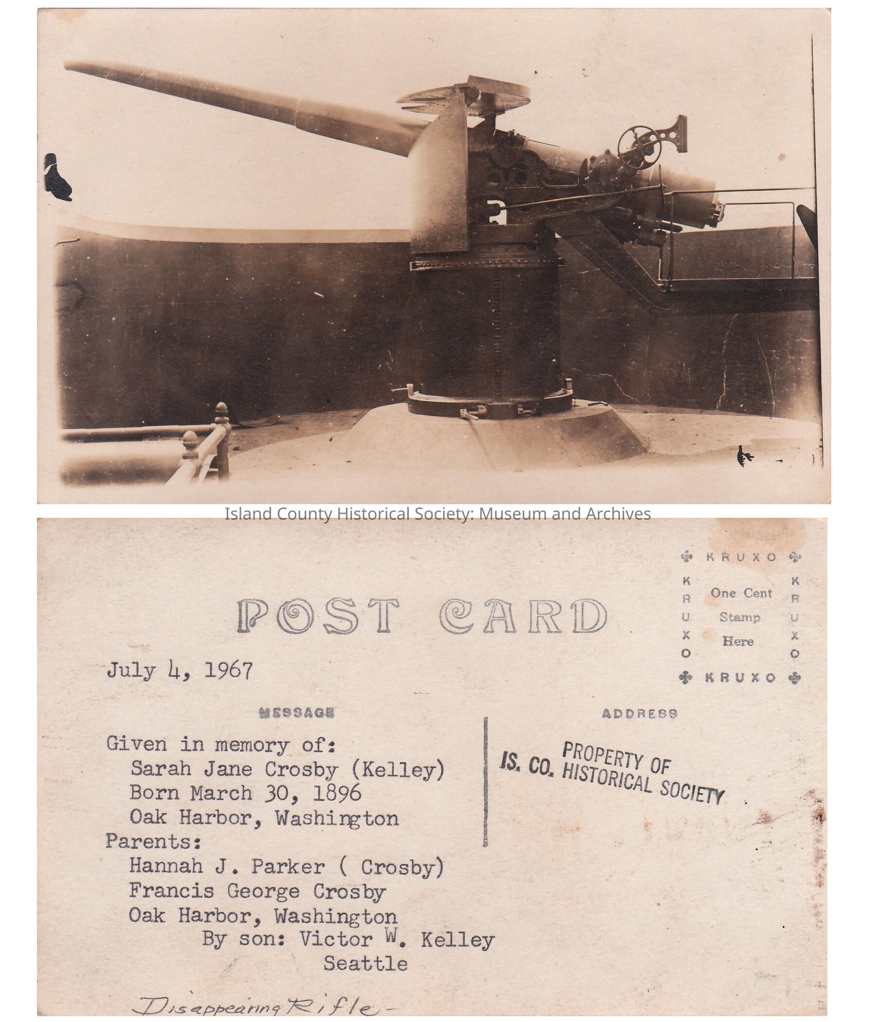 Disappearing Rifle, donated in memory of Sarah Jane Crosby (Kelley) by son Victor W Kelley