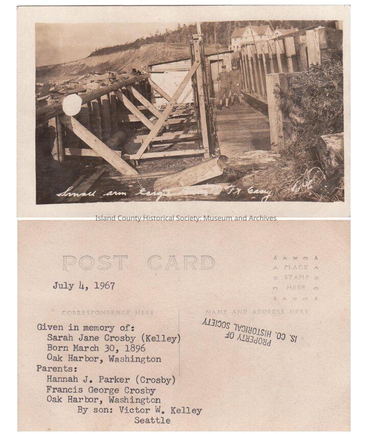 Two soldiers at Fort Casey, donated in memory of Sarah Jane Crosby (Kelley) by son Victor W Kelley 3/30/2016: Rifle Butts (target area) Fort Casey Parade Ground west water side. Moved to upper Fort Casey in WWII. (SJK)