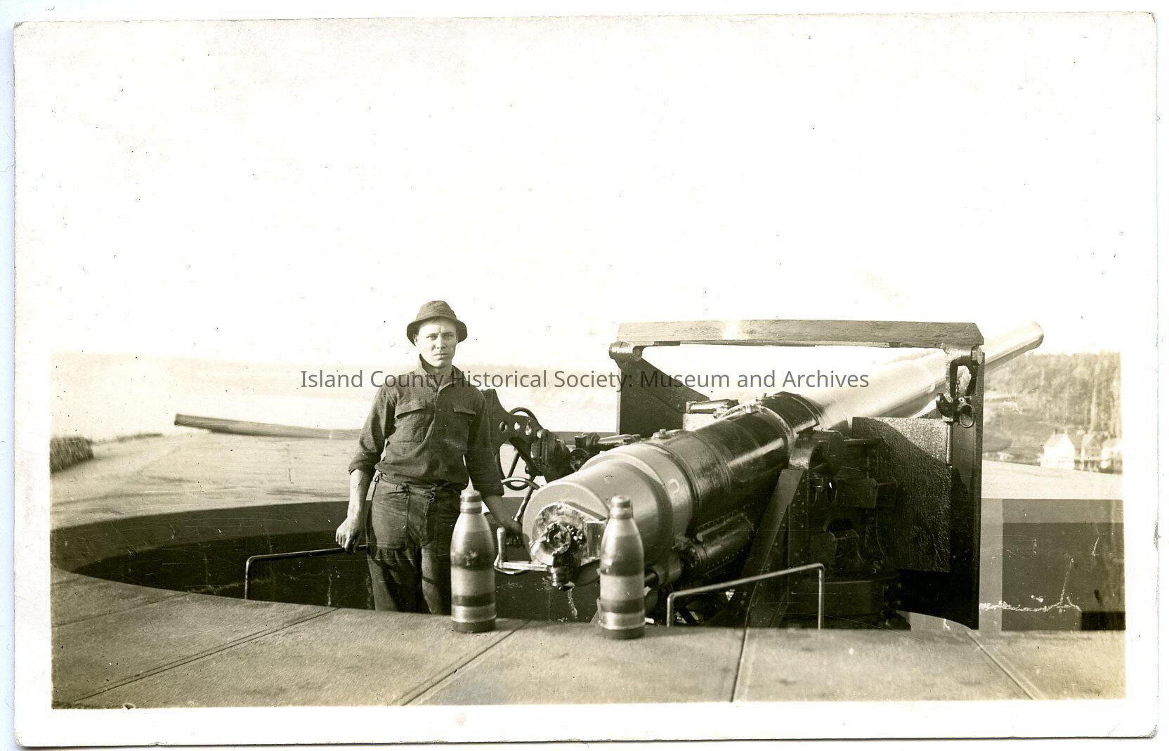 Black and white postcard photograph of a Fort Casey soldier next to a gun.